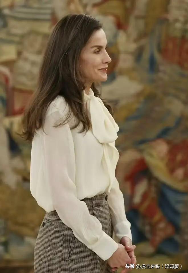 王后在王宫主持了三场接待会。白色蝴蝶结衬衫已经穿过很多次了。搭配宽松柔软的格纹长