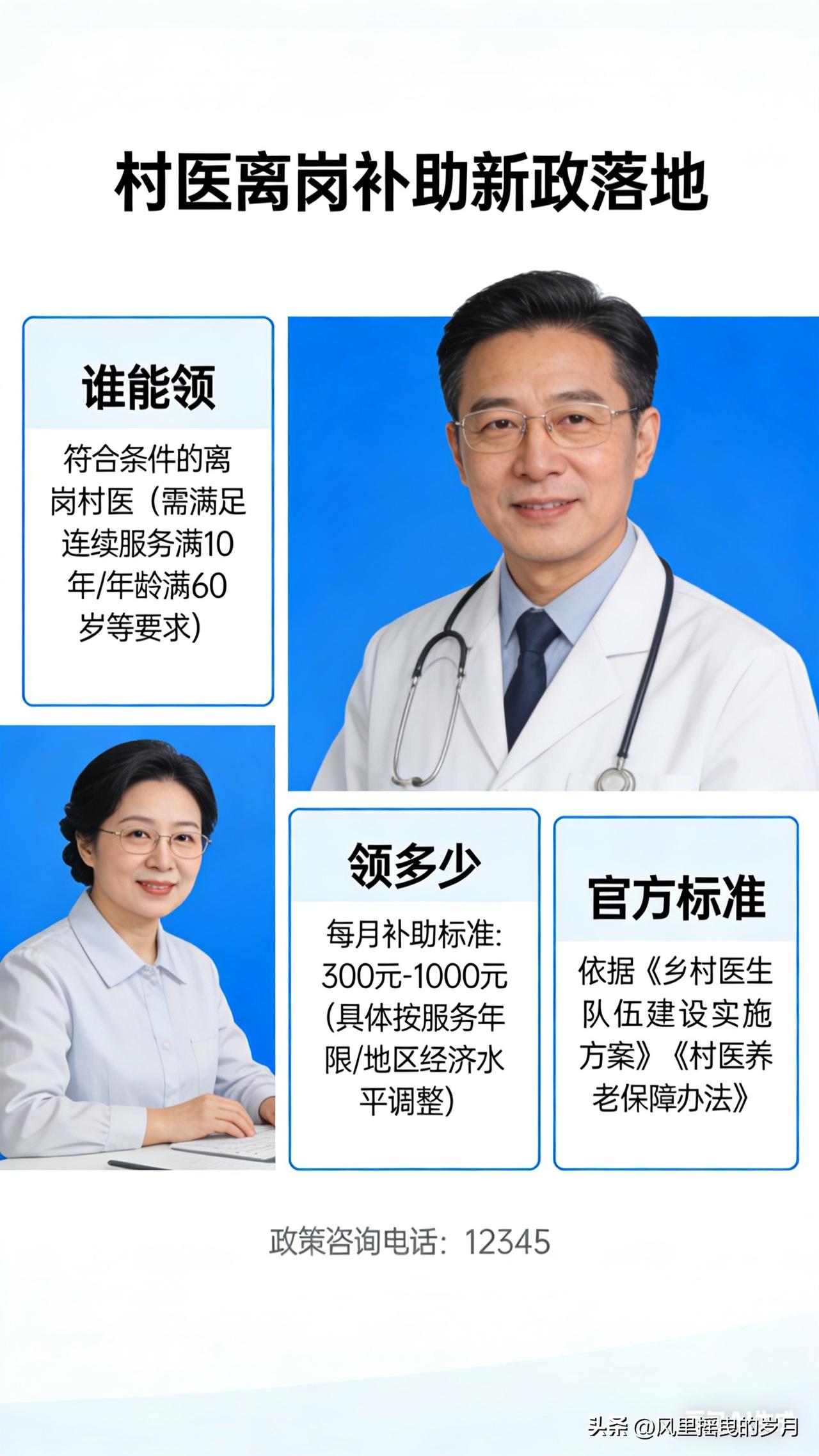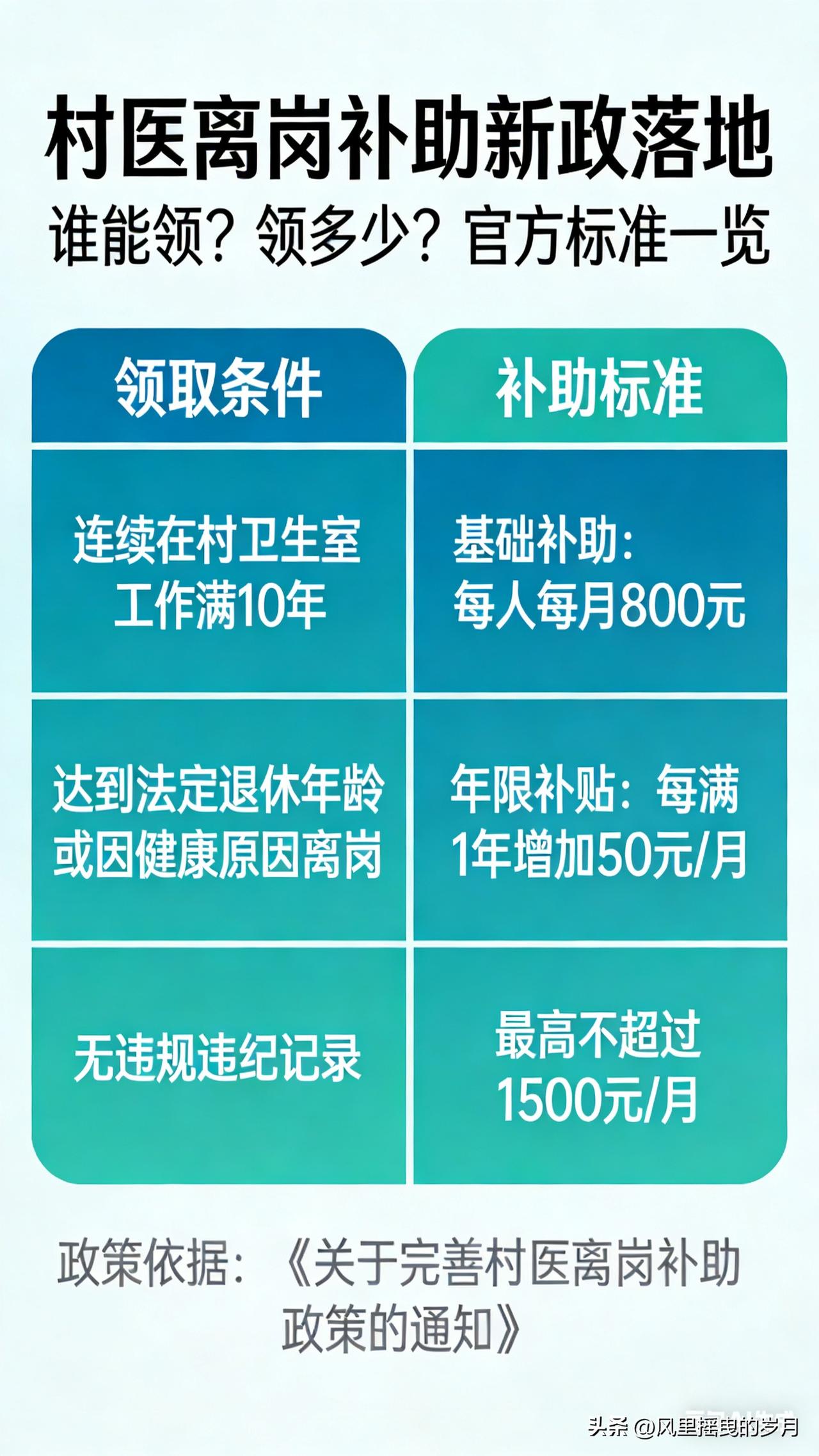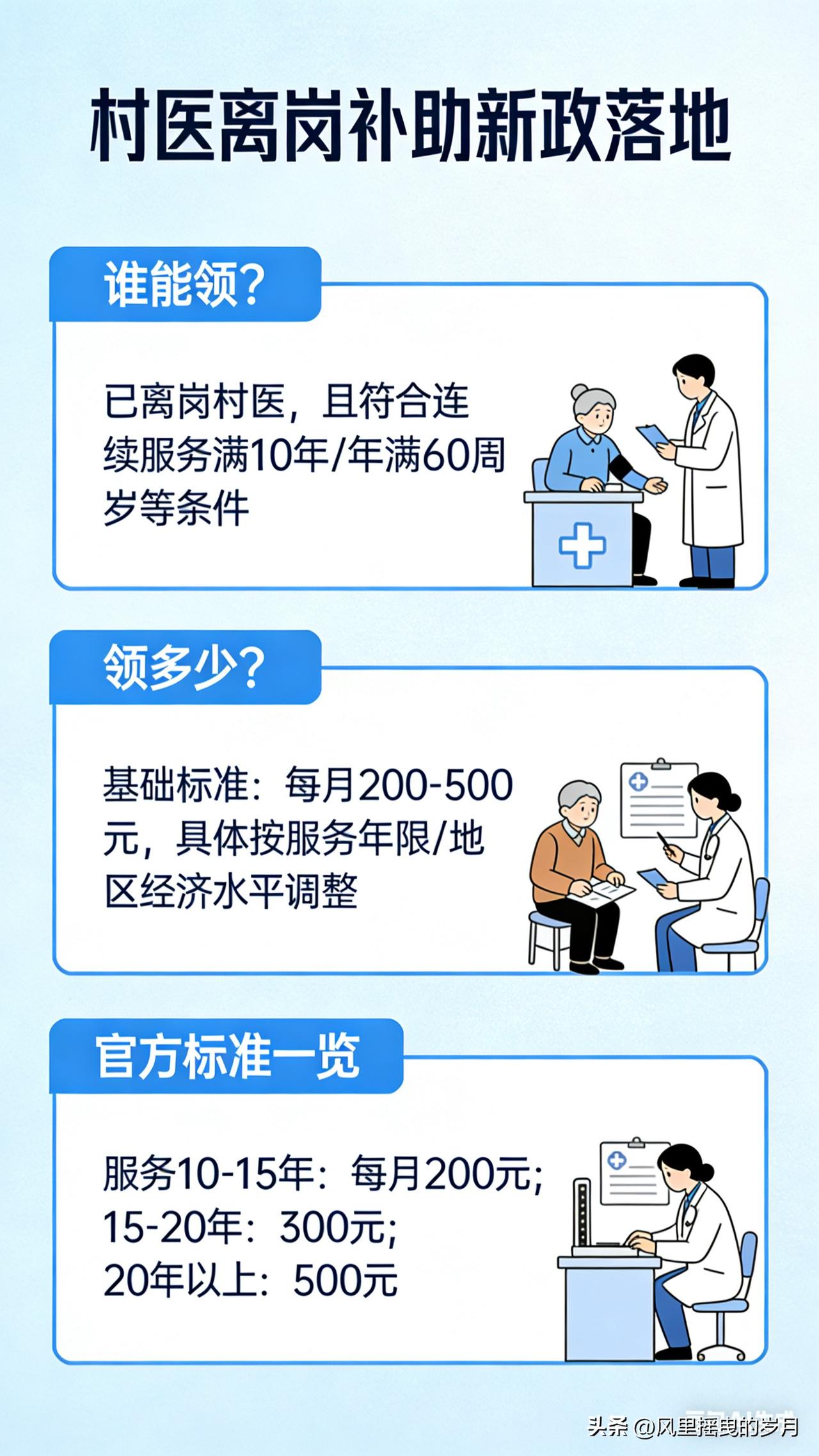 我为你整理成政策解读稿,信息清晰、可直接发布,重点标注谁能领、领多少、怎么领。 村医离岗补助新政落地:谁能领?领多少?官方标准一览 近期,全国多地离岗乡村医生生活补助新政陆续落地,明确领取条件、补助标准、申领流程,让长期扎根基层的老村医老有所养、待遇有保障。本文按官方口径,把核心规则讲清楚、算明白。 一、谁能领?全国通用认定条件 同时满足以下4项,即可纳入补助范围: 1. 年龄:男性满60周岁、女性满55周岁,正常到龄退出村医岗位; 2. 身份:持有乡村医生证/赤脚医生证/执业(助理)医师证,经县级卫健部门注册备案; 3. 工龄:累计在村卫生室执业满10年及以上,30年以上列为重点保障对象; 4. 保障:未享受机关事业单位、国企职工养老保险的,全额领取;已参加居民/职工养老的,多地明确可叠加享受。 不予领取情形 - 因违纪违法、医疗事故被吊销资质或开除的; - 擅自离岗、未按规定办理退出手续的; - 已享受同类财政养老补助的(不重复发放)。 二、领多少?官方标准分档一览 国家层面定原则,各省按经济水平细化,主流为工龄阶梯制、按年递增制,按月发放、直接打卡。 全国通用参考档位(2026年执行) - 工龄10–19年:每月300–400元 - 工龄20–29年:每月400–500元 - 工龄30年以上:每月500–800元(重点倾斜,部分地区上不封顶) 重点省份细则(官方依据) - 安徽:每满1年每月补16元;30年及以上每月不低于528元,部分县上调至600–800元。 - 山东:每满1年每月补20元;30年工龄=600元/月,偏远地区上浮10%–20%。 - 河南:10年≥300元、20年≥350元、30年及以上≥400元,省市县财政共担。 - 四川:按年限分档,25年以上每月190元、20–24年150元、15–19年110元;5年及以下一次性补助。 - 甘肃:每满1年每月8元,省市县按4:3:3分担。 三、怎么领?材料+流程一步到位 必备材料 1. 身份证、户口本、社保卡原件及复印件; 2. 乡村医生证、执业证等资质证明; 3. 村委会+乡镇卫生院盖章的工龄证明、离岗证明; 4. 补助申请表、工龄认定表(现场领取填写)。 办理流程 1. 本人向乡镇卫生院/卫健办提交申请; 2. 乡镇初审+公示(30个工作日); 3. 县级卫健、财政终审(30个工作日); 4. 公示无异议后,次月起按月打卡发放。 全程免费办理,不委托任何中介,谨防诈骗。 四、新政亮点 - 工龄越长补助越高,30年以上老村医重点倾斜; - 不与居民养老冲突,多地可叠加,保障更足; - 财政共担、按月直达,杜绝拖欠; - 流程简化、公示透明,公平可查。