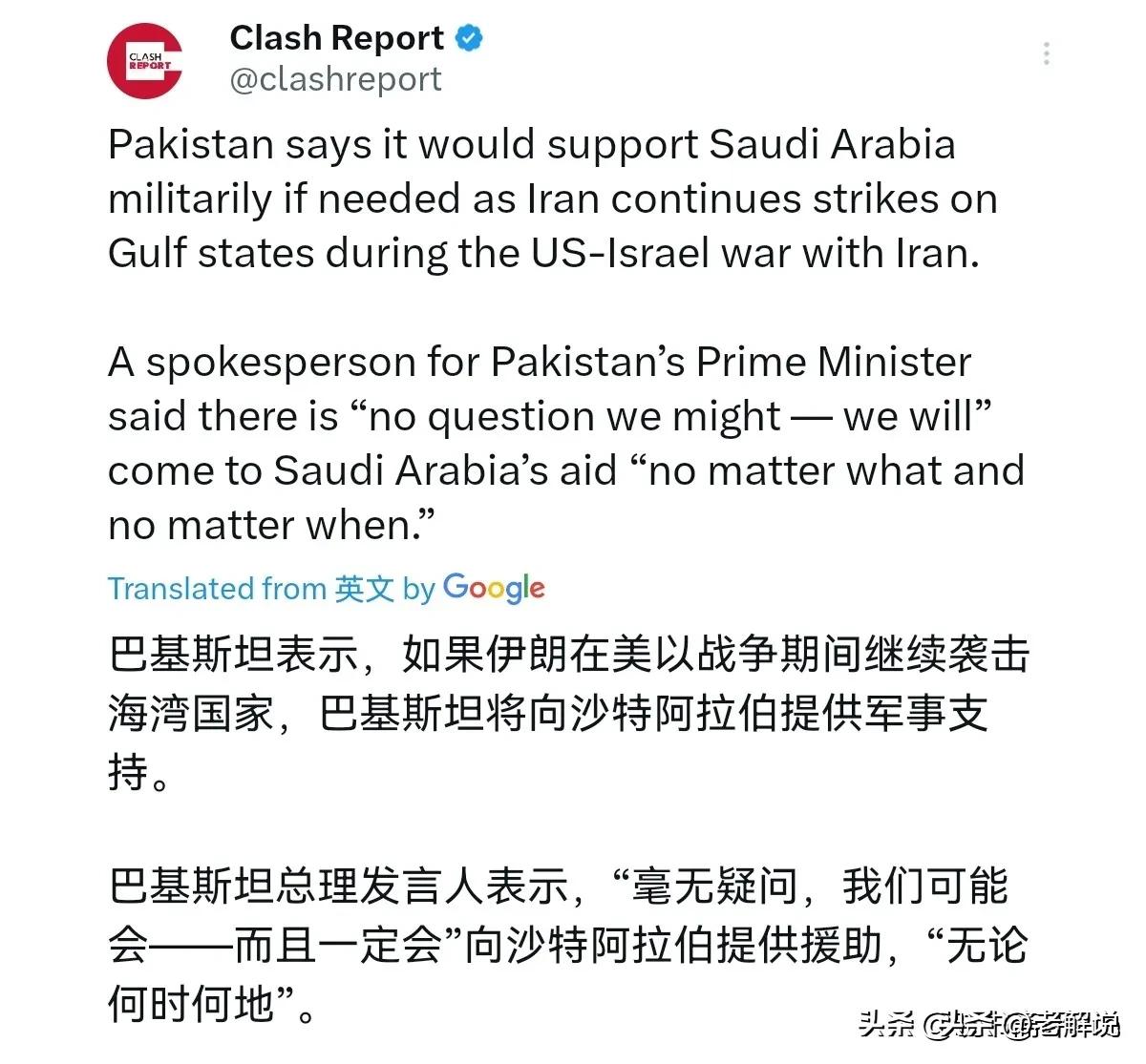 巴基斯坦不等了!巴基斯坦总理谢里夫刚向伊朗最高领袖致函称,承诺继续与伊朗伊斯兰共和国密切合作,进一步加强所有共同利益领域的双边合作,造福两个兄弟国家的人民。转过头去,巴基斯坦不等沙特与伊朗缓和关系,就对沙特交了底!无论何时何地,我们都可能会向沙特阿拉伯提供援助。3月11日,巴基斯坦明确对沙特交底称,如果需要,它将在军事上支持沙特阿拉伯。 巴基斯坦总理的发言人说,毫无疑问,无论何时何地,我们都可能会向沙特阿拉伯提供援助。因为在美以战争期间,伊朗继续对海湾国家发动袭击。 巴基斯坦这波操作,说白了在中东这个大棋局上玩了一把非常高明的“平衡术”,也可以说是被逼到墙角不得不做出的选择。你看它这两天的动作,简直就是冰火两重天。 头一天,总理谢里夫还客客气气地给伊朗新最高领袖写信,满篇都是“兄弟国家”、“密切合作”、“共同利益”,姿态放得特别低,关系看着还挺热乎。 结果转头就对沙特交了底,而且是那种最重的底:只要你需要,我随时可以派兵,没条件可讲。 这种180度的大转弯,乍一看特别精分,但仔细琢磨,这恰恰是巴基斯坦在地缘政治的夹缝里求生存的真实写照。 巴基斯坦对沙特说“无论何时何地”都支持,这话分量太重了,重到可以直接改变中东的力量对比 。这背后的原因其实特别简单,就是利益和生存问题。 沙特对巴基斯坦来说,不仅仅是“土豪大哥”,那是真正的“金主”和“大后方”。几百万巴基斯坦劳工在沙特打工,每年往国内汇回来的钱是巴基斯坦经济的重要命脉 。 而且两国去年刚签了共同防御协定,这可不是闹着玩的,是正儿八经的军事同盟,甚至有人说这等于把巴基斯坦的“核保护伞”间接罩在了沙特头上 。 现在沙特被伊朗的导弹和无人机骚扰,如果巴基斯坦这时候怂了,装看不见,那以后还怎么在中东混? 经济援助、能源供应,甚至巴基斯坦在国际上的话语权,全得崩盘。所以,对沙特的支持,巴基斯坦根本没得选,这是它的立身之本。 再看他给伊朗写信那事,那更像是一种外交上的“缓兵之计”和“礼节性问候”。 巴基斯坦和伊朗虽然是邻国,但关系一直很微妙,既有合作,更多的是猜忌,尤其是两国边境那块儿,经常是武装分子窜来窜去,互相看着不顺眼 。 现在伊朗正跟美以死磕,国内民情激愤,巴基斯坦如果这时候跳脚骂街,等于是在自己家门口点火。 写信说点好听的,承诺继续合作,一方面是稳住伊朗,告诉德黑兰“我虽然站队沙特,但不想跟你撕破脸,咱们的生意该做还得做”;另一方面也是给国内占相当比例的什叶派民众一个交代,别让他们觉得政府完全倒向逊尼派的沙特,引发内部分裂 。 这封信就像是在给一个正在气头上的邻居递颗糖,嘴上说着甜话,手里却已经攥紧了棍子站在另一个大哥身后。 更有意思的是,巴基斯坦在这个节骨眼上还一直在中间当和事佬。他的军方和外交官两头跑,一边跟伊朗说“别打了,再打海湾国家真顶不住了”,一边跟沙特说“稳住,我帮你盯着” 。甚至有消息说,伊朗私下也给了巴基斯坦一个台阶,表示只要沙特不用自己的地盘当跳板打伊朗,那伊朗也可以考虑不炸沙特 。 这就很微妙了,巴基斯坦其实是在用自己的信誉和军事存在,给两边画了一条临时的“红线”和“安全区”。 它真正怕的,不是自己要不要参战,而是万一沙特和伊朗真的全面开打,自己被夹在中间,进也不是退也不是,那才是真正的噩梦。 所以说,巴基斯坦这套“左右横跳”的组合拳,看着矛盾,实则精明得很。 它先用最强硬的态度稳住最核心的盟友沙特,保证自己的经济命脉不断;再用最柔软的外交辞令稳住隔壁的伊朗,防止边境起火;同时还不忘拉着大国搞外交斡旋,给自己留足后路 。这哪是简单的选边站队,这分明是在走钢丝。只是现在这根钢丝越来越烫脚,美伊冲突越来越大,巴基斯坦这种“两头都抓”的空间已经被压缩得越来越小。 一旦伊朗认定巴基斯坦的“军事支持”不是空话,而是真的会派飞机大炮过来,那这封充满兄弟情谊的信,恐怕就真成了废纸一张了。