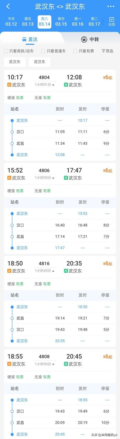 3月14号起武汉东站开行始发4趟普速列车环线,到4月2号 武汉市区有多个铁路火车站,共同组成了武汉铁路枢纽,这些车站之间大多数有能够直通的列车,不过开行普速环线列车还是首次。 3月14日到4月2日,武汉局安排武汉东站始发开行普速列车环线,车底为25B型, 时速120公里以下,非常经典的一款老式绿皮火车,顺时针环线4816、,先到武昌站、汉口站,最后返回到武汉东站,逆时针环线4804、4806、4808,则是先到汉口站,再到武昌站,最后也是回到武汉东站。 全程大约两个小时,武汉东站环线列车,全程票价仅需6元,到武昌站仅需三元,在时间分布上,上午,下午各一趟,白天欣赏武汉环城风光,傍晚列车两趟,晚间欣赏武汉夜景风采。