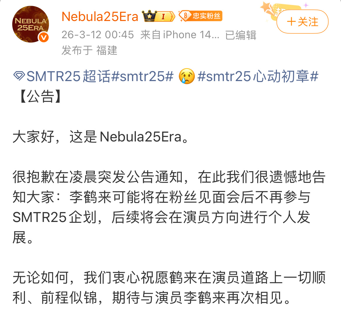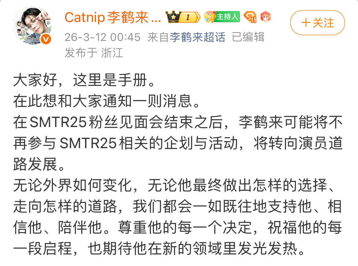 李鹤来疑似退出smtr25 粉丝站发文,李鹤来可能将在粉丝见面会后不再参与smt