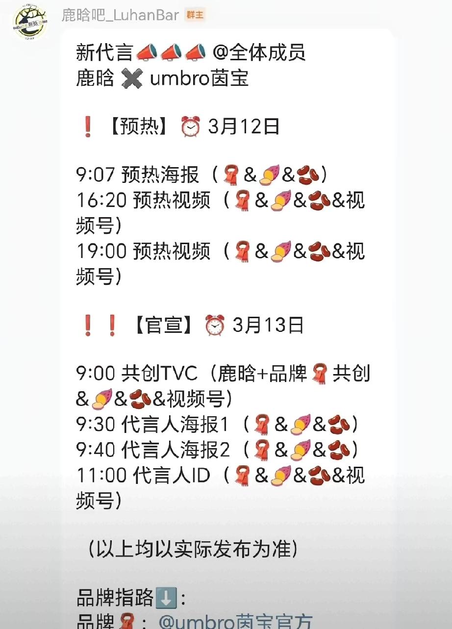 鹿晗终于翻盘!商务归零后官宣新代言,粉丝与工作室破冰 3月12日,鹿晗突然冲上热搜,迎来重磅好消息!此前他被曝商务近乎归零,肯德基十年合作到期、Gucci等高端代言相继结束,2025年无新增商务,粉丝还公开向工作室提六项诉求,矛盾拉满。 如今官宣将代言英国百年运动品牌umbro茵宝,3月13日正式公布,足球基因与鹿晗爱好高度契合。这不仅打破资源断层传言,更被视为粉丝与团队的破冰信号,商业价值强势回温,期待鹿晗事业重启! 鹿晗报喜 鹿晗跑男十周年