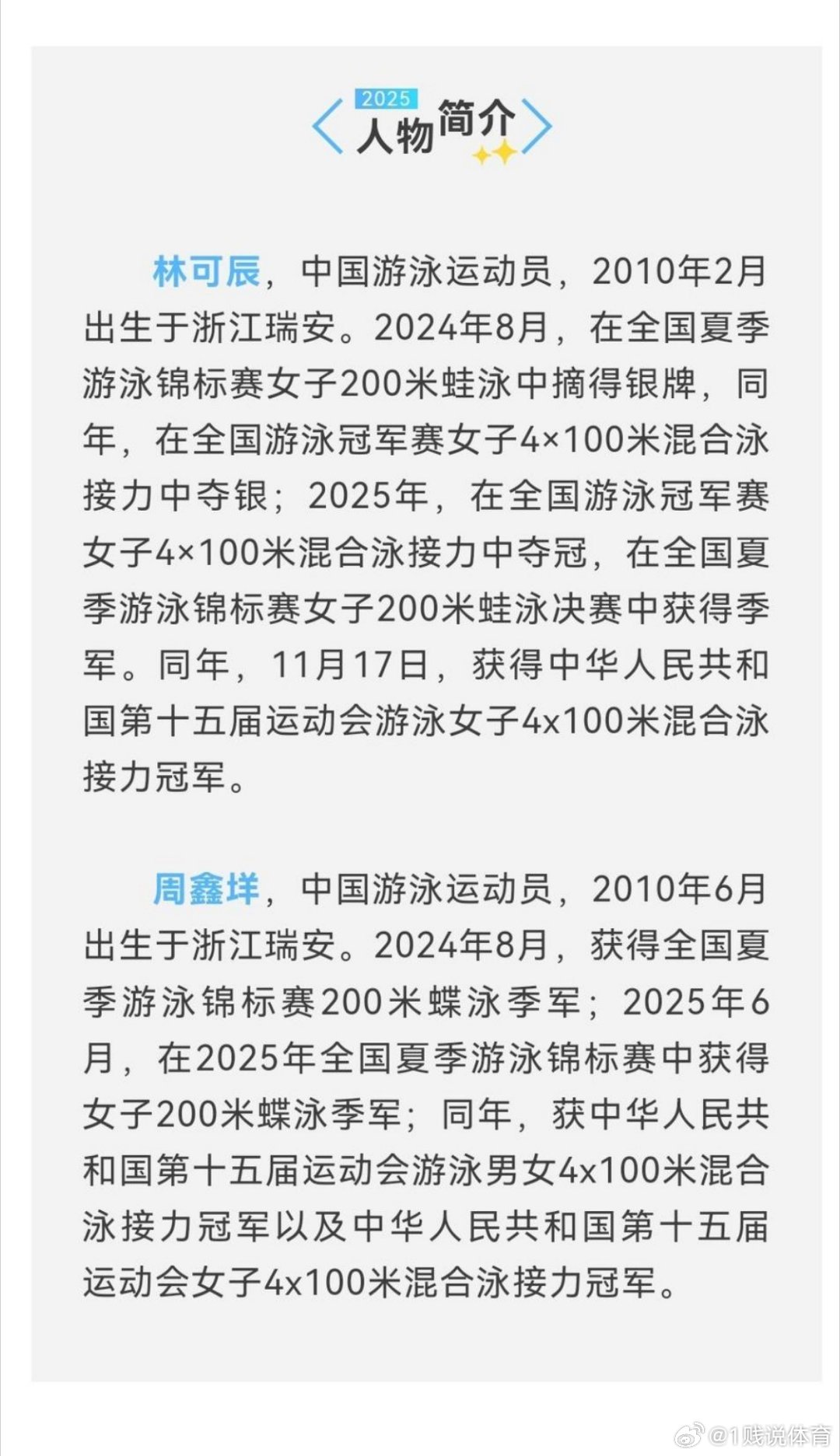 一场全运会,引来很多人说浙江游泳不行了,衰落了……客观分析下浙江游泳到底有没有未来,有没有新秀。 女队新秀众多,以全运会为例: 仰泳有11年生上单项领奖台的鲁星辰,还有04的钱心安可以当混接替补。 蝶泳有10年生单项第四名57.99的周鑫垟,估计会成为余依婷混接替补(指国内比赛,全运会、冠军赛等)。 蛙泳有10年的林可辰,全运会100蛙半决赛第10名,比叶诗文慢0.01,这个不是很强但以后也能弥补浙江队蛙棒的缺环。还有位12年的徐佳玥200蛙进入决赛。 自由泳有11年的范亚琦,10年严窕珊,09年孔雅琪,200自全部达到1:57+。另有老将柳雅欣破1:55,中生代余依婷破1:56.5,吴卿风也有1:57+。去年全国排名前十有五位浙江选手,霸榜女子200自接十年没问题。全运会是吴卿风生病上不了,加小队员紧张不敢跳,反应时有河北那么快就赢了。河北队两个00年的,平均年龄远比浙江大。 100自接差不多也是类似阵容,全运会丢金因为上了老将朱梦惠,她分段55秒多,加上吴卿风生病没追回来。决赛朱梦惠棒换小将都不会丢,但浙江队接力四上四下,人选按冠军赛名次,半年时间过去有人状态变化大,过于死板。 另50自有从山东引进的队员吕越获得铜牌,06的当年19岁,尚可。 综合看,女队三个接力都有新人,未来国内比赛垄断接力冠军问题不大。新人里相对突出的是鲁星辰、范亚琦和周鑫垟,但也不能高估。 鲁星辰当初宣传的父母及本人小时候身材很高,这没问题。但从24年初到25年初也就是13到14岁只长了1厘米175到176,又过一年全运会看上去还是176,估计很难再长。也就是和很多小天才一样发育早,13岁基本成年身高。长不到傅园慧赵菁身高,和万乐天差不多。她是纯短仰项目,176破全国纪录有可能,接近凯利麦基翁、小刷子水平基本不可能。范亚琦估计175左右,头长颈长,肩高不算高。另外接受采访十分腼腆和一般运动员外向开朗不同。从小以有氧耐力见长,估计以后可能成为国家队200自接队员,领军人物难。周鑫垟同龄100蝶不如当时是副项的余依婷,身材比余依婷高一点估计173到174左右。同样有可能进国家队,继续突破难。 浙江男队确实只有谢以忱一位亮眼新人,他200混同龄不错,400混一般,蛙泳也可以,估计以后会长期在国内比赛混接上蛙泳棒。谢以忱主要问题是身材不高180左右,但有和年龄不相称的强壮。这样的运动员一般都发育早,真正顶级天赋的往往身材高,发育正常或晚,小时候瘦高条,比如仅有的三位男子奥运单项冠军全都如此。身材不高但十分强壮远超同龄的,往往都是发育早,成年后提高不太多。小谢以后进国家队有可能,在浙江队担纲蛙泳棒问题不大,成为领军人物难度很大。 浙江男队确实缺新秀,主要是05-09年没出什么高手,断档严重。为今之计只有尽量维持中生代水平,包括潘展乐费立纬沈加豪洪金权等等,争取多撑几年,看看以后有没新人。 总体看浙江队有新秀,主要集中在女队,围绕女队三个接力项目,三接力都在国内有明显优势。男队确实只有一位亮眼新人,徐嘉余退役后接力堪忧。但浙江队新秀各有弱点,估计单项很难达到国际先进水平,主要目标是全运亚运和国家队接力,缺乏领军人物。