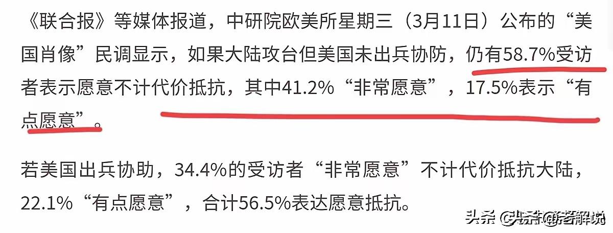 岛内《联合报》声称,若中国大陆执意武统,58.7%受访者表示愿意不计代价抵抗!3月12日,根据岛内媒体报道,岛内公布的“美国肖像”民调显示,如果大陆攻台但美国未出兵协防,仍有58.7%受访者表示愿意不计代价抵抗,其中41.2%“非常愿意”,17.5%表示“有点愿意”。 若美国出兵协助,34.4%的受访者“非常愿意”不计代价抵抗大陆,22.1%“有点愿意”,合计56.5%表达愿意抵抗。 先看谁做的。主导这份“美国肖像”民调的,是东吴大学潘欣欣副教授,她长期立场偏绿,多次配合民进党鼓吹“抵抗意志”。连台媒都承认,这类机构做的民调,问题设计、用词引导都暗藏玄机。 “不计代价”四个字听着悲壮,可到底指啥?是愿意捐钱囤粮发个帖,还是真扛枪上战场送命?淡江大学学者早就点破:这种数据顶多反映“嘴上愿意”,真到行动时,没几个人真敢豁出去。 台湾年轻人现在最头疼的就是兵役——增肥、装病、自伤逃避兵役的新闻屡见不鲜,兵源短缺成了台军老大难。 连民进党自己提拔的前防务部门负责人冯世宽、严德发都公开说过:台军不会为“台独”而战。自己人都不信,还指望老百姓卖命? 再拿其他民调一对比,立马露馅。2025年初台湾大学生论坛Dcard的匿名调查,七成学生直言“开战就投降”; 《远见》杂志去年做的中立民调更实在:问“愿不愿意让家人上战场”,63.9%的人坚决说“不”,只有15%表示“很愿意”。连深绿大佬吕秀莲都改口承认“台湾属于中国一部分”,还说若因“台独”开战,民进党该“切腹谢罪”。这些数据才更贴近真实民意——台湾同胞要的是和平过日子,不是被绑上“台独”战车当炮灰。 为啥这份民调故意挑这时候放?明眼人都懂:民进党正推动把防务预算拉到GDP的3%,急需“民意支持”来忽悠民众加税买武器。那些天天喊“抗中保台”的绿营政客,自家子女有几个真去当兵?自己躲在安全屋喊口号,却鼓动普通家庭送孩子上火线,这不是虚伪是什么?更讽刺的是,数据本身都自相矛盾:按常理,美国不出兵时抵抗意愿该暴跌,可它偏说“不出兵反而更愿抵抗”,逻辑硬伤太明显。 其实台湾民众的担忧很真实——他们怕战争,但根源恰恰是赖清德当局不断“谋独”挑衅、勾连外部势力,把台海局势炒得火药味十足。解放军军演从来不是针对台湾同胞,而是反制“台独”冒险,守护两岸和平。大陆始终以最大诚意推动和平统一,惠民政策、融合发展从未停步。可“台独”势力偏要拿民调当遮羞布,把少数人的政治私利包装成“全民意志”,既欺骗台湾民众,也误导国际视线。 说到底,民意不是靠办公室里编数字就能伪造的。两岸同胞血脉相连,绝大多数台湾乡亲心里门儿清:统一是大势,和平是福祉,“台独”是死路。与其沉迷“抵抗幻觉”,不如正视现实——放下对抗,携手发展,才是对台湾2300万同胞真正的负责。咱们坚信,随着时间推移,越来越多台湾朋友会看清真相,和大陆同胞一起,把两岸关系的主动权牢牢握在追求和平与团圆的手中。 那些炒作“全民抵抗”的人,要么是看不清大势,要么是别有用心。两岸同胞血脉相连,和平统一是唯一正确的道路。大陆方面有最大的诚意争取和平前景,也有坚定的意志、充分的能力和一切必要手段,捍卫国家主权和领土完整。历史的车轮滚滚向前,任何逆流而动的企图,都注定是螳臂当车。 对于台湾同胞而言,看清谁在煽动对抗、谁在维护和平,谁在制造风险、谁在保障福祉,做出符合自身根本利益和民族大义的选择,才是真正的明智之举。