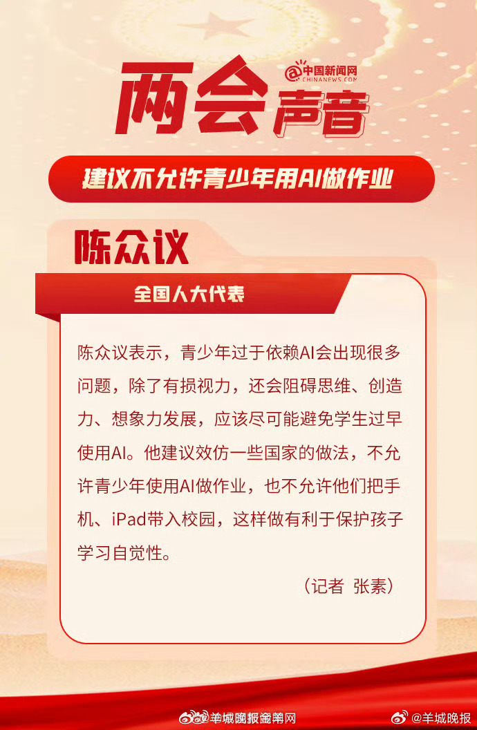 【#代表委员建议中的教育热点#】#微观两会# “建议不允许青少年用AI做作业”“建议小学三年级前课间半小时”“建议缩短研究生考录时间”“建议遏制高校宿舍直播乱象”……(中国新闻网)#2026年全国两会看广东##2026全国两会齐关注#