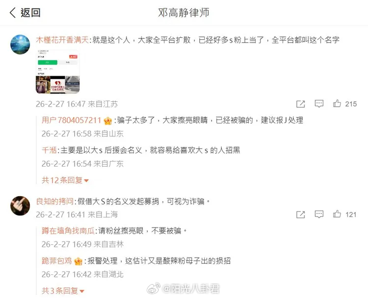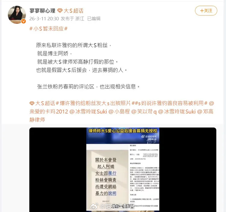 大S女粉丝被指假冒后援会募款大S女粉丝发声许雅钧也受骗?大S女粉丝发声澄清没私联,她与许雅钧的交流都是在包含小S助理的三人工作群组进行,内容仅限对大小S的支持与缅怀,不过这名阿娇自称大S粉丝爱心公益后援会发起人,有粉丝直指是S妈委任律师邓高静打假对象。 小S闺蜜说为许雅钧感到委屈
