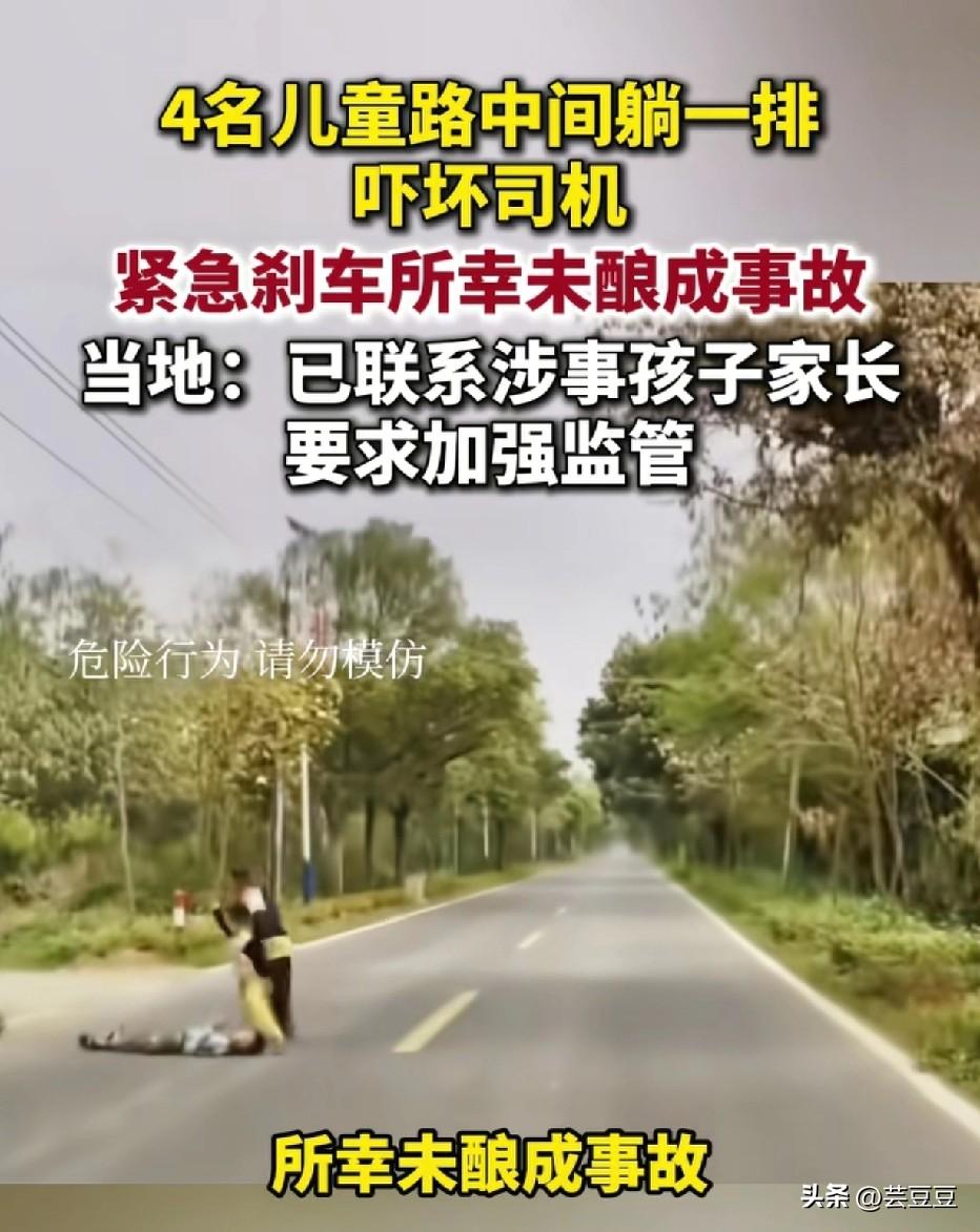 太吓人了!4个孩子横躺马路中间,变成一条直线,司机直呼:以为是塑料袋! 近日,广东清远,4名小孩居然排成一排,直直躺在马路正中间玩耍。 开车路过的司机远远一看,还以为是路上的塑料袋,等靠近才惊觉是孩子! 幸好司机反应快,孩子们也及时起身跑开,才没有酿成惨剧。 后来官方通报:孩子们只是交通安全意识太淡薄,纯属无知贪玩,万幸没人受伤。 可想想真的后怕: 马路是车来车往的地方,不是自家床,也不是游乐场。 司机有盲区、有反应时间,一旦没看见、没刹住, 那就是几条人命、几个家庭的崩溃,后悔都来不及! 很多孩子根本不知道危险有多近, 他们只觉得好玩、刺激,却不知道一次贪玩,可能就是一辈子的遗憾。 为人父母,别的可以慢慢教, 交通安全、保命意识,一刻都不能等! 别等出事了才追悔莫及,别让无知贪玩,毁了孩子,也害了别人。 家里有娃的,一定要把安全刻进心里! 大家说这样的孩子是不是该狠狠打一顿?