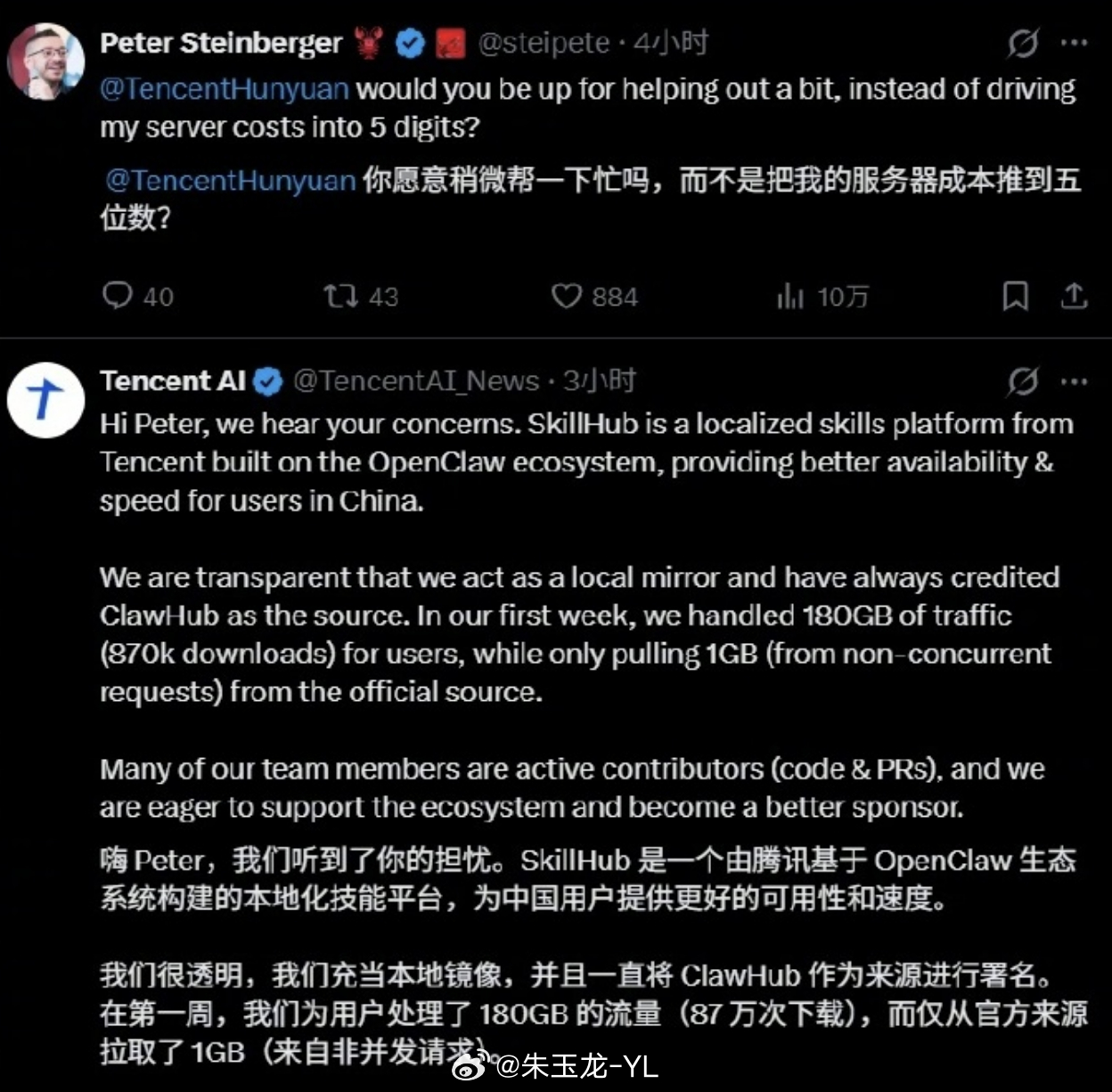 腾讯 AI 官方 X 账号回应称:SkillHub 是一个由腾讯基于 OpenClaw 生态系统构建的本地化技能平台,为中国用户提供更好的可用性和速度。我们很透明,我们充当本地镜像,并且一直将 ClawHub 作为来源进行署名。在第一周,我们为用户处理了 180GB 的流量(87 万次下载),而仅从官方来源拉取了 1GB(来自非并发请求)。