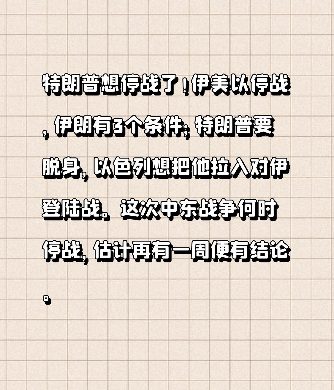 特朗普想停战了! 伊美以停战,伊朗有3个条件; 特朗普要脱身,以色列想把他拉入对伊登陆战。 这次中东战争何时停战,估计再有一周便有结论。