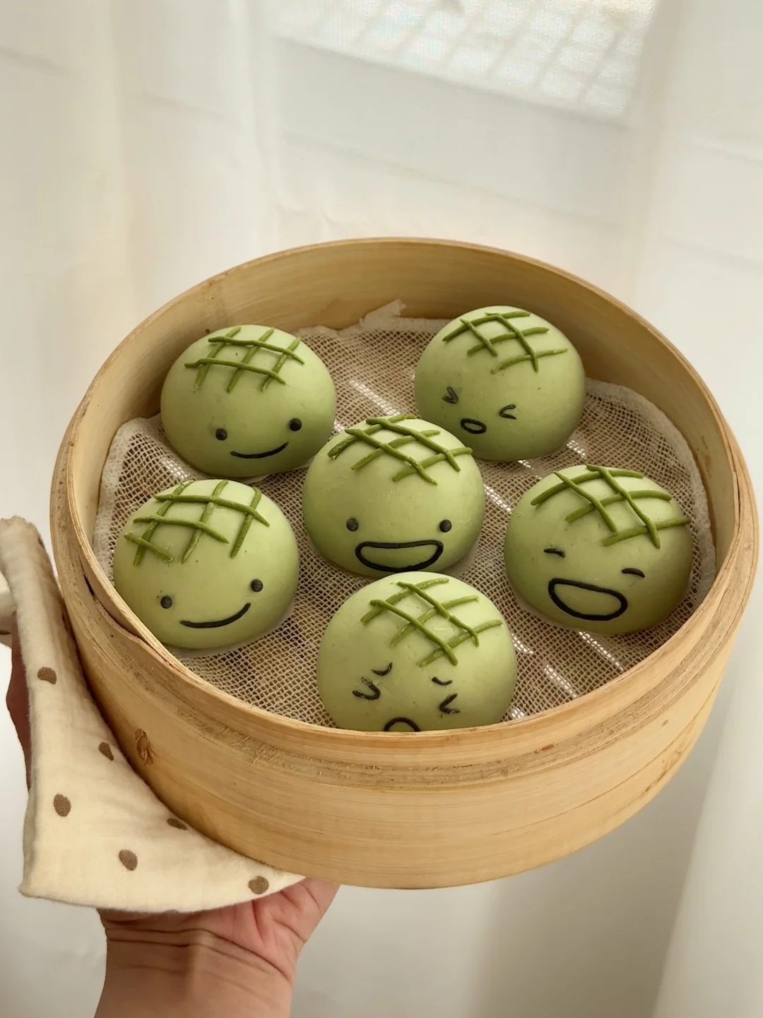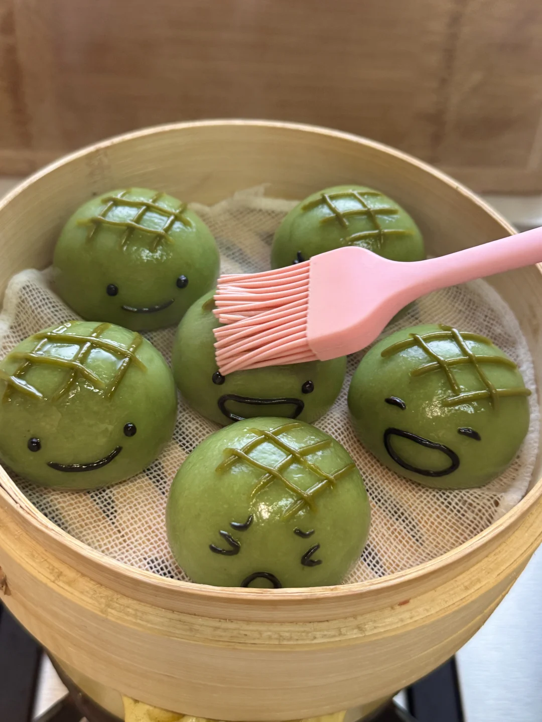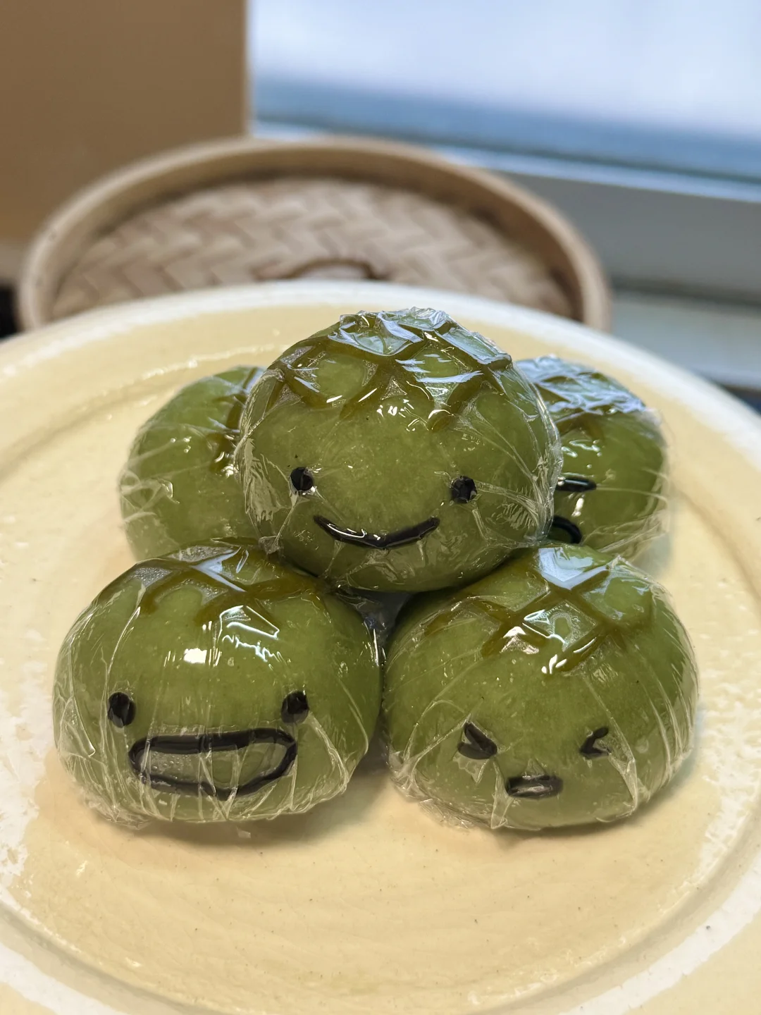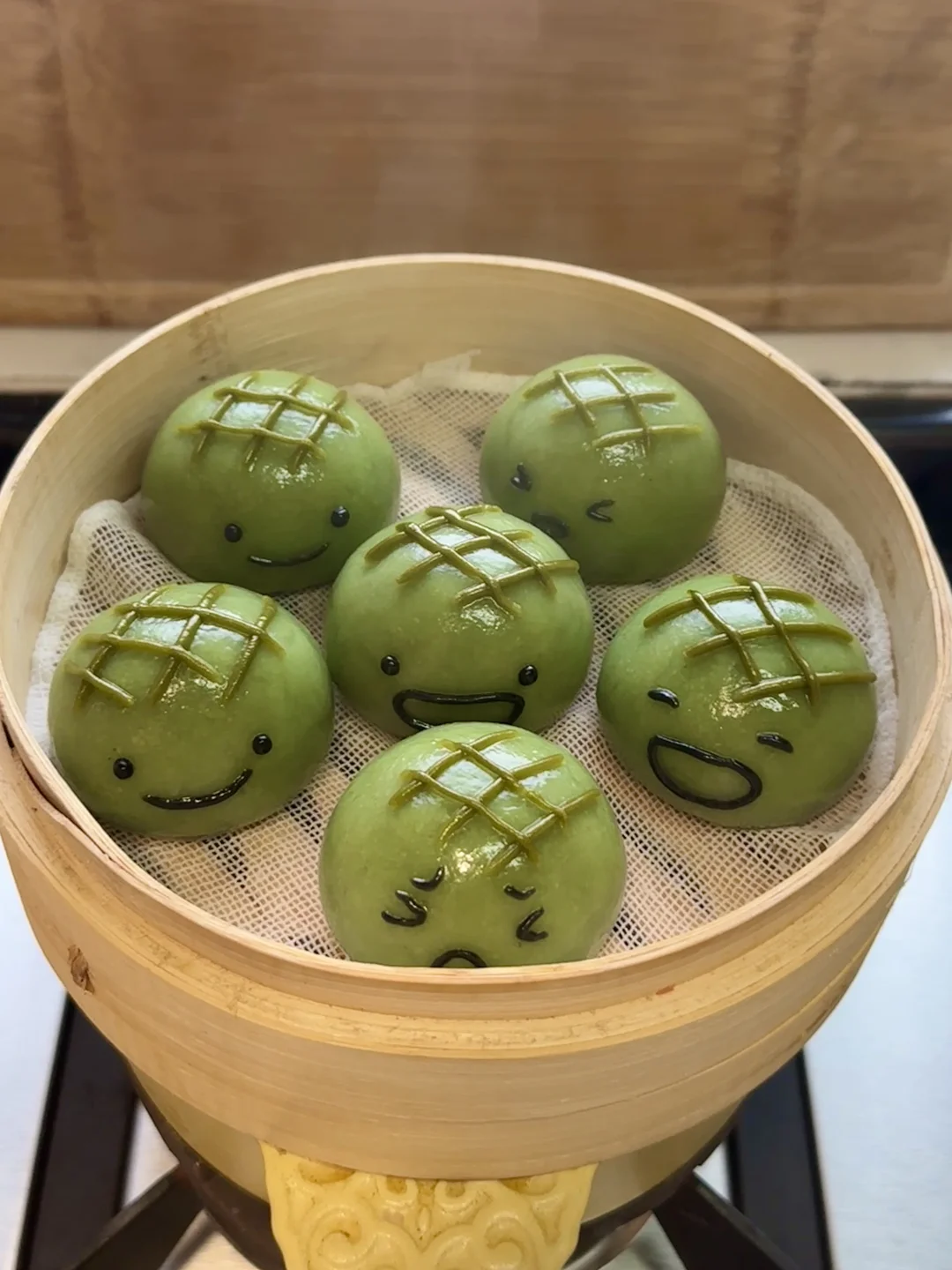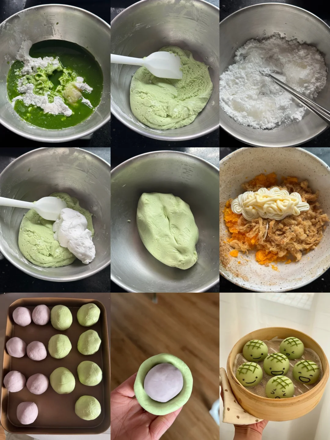 一起左划帮我蒸青团吧! - 材料(8个) 1:糯米粉100g、过滤的艾草汁90g、猪油5g、白糖15g 2:澄粉50g、滚烫的开水40g 3:肉松咸蛋黄15g/个、芋泥15g/个 步骤: 1️⃣将糯米粉、猪油、白糖和过滤好的艾草汁混合成团 2️⃣澄粉加入开水搅拌成半透明的面团,混合到艾草面团里揉匀,均分成8份,包入提前准备好的芋泥肉松 3️⃣另准备一份糯米面团调色,给青团加上表情 4️⃣水开后上锅中大火蒸8分钟,出炉后及时刷油