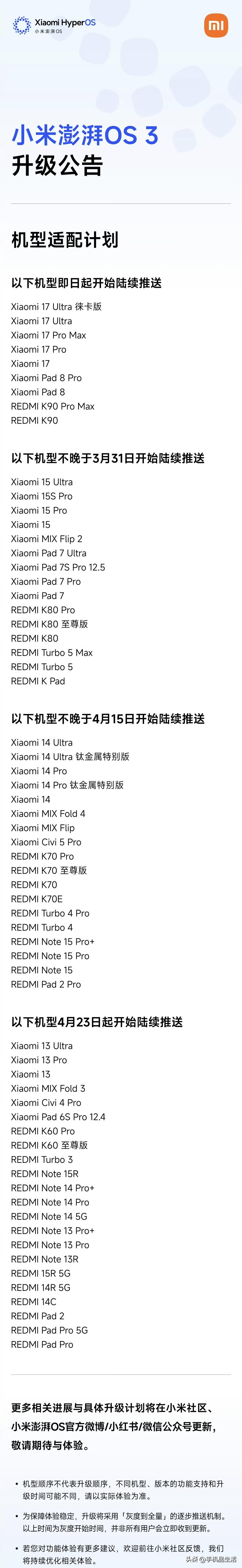 小米澎湃OS 3系统焕新升级计划公布,小米17系列、小米Pad 8系列、REDM