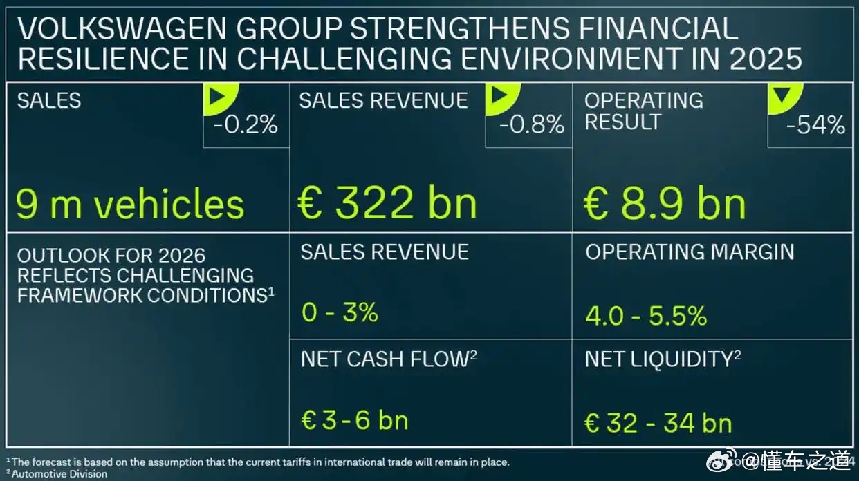 懂车之道讯 懂车之道快讯,德国汽车制造商大众汽车集团对外发布2025年财务报告。数据显示,2025年汽车集团全年营收为3219.13亿欧元,同比微降0.8%;营业利润为88.68亿欧元,同比下滑53.5%;经营回报率从5.9%降至2.8%。销量方面,数据显示,2025年全年大众汽车集团销量为902.74万辆,同比下滑2.3%;纯电动车销量为74.48万辆,同比下滑3.4%。