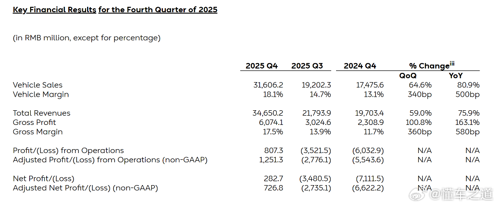 懂车之道讯 懂车之道快讯,蔚来汽车继续亏损,蔚来发布2025年第四季度财报及去年全年财报。数据显示,去年第四季度蔚来营收为346.5亿元,与上年同期相比增长75.9%。毛利方面,去年四季度总额60.7亿元,同比增长163.1%;整车毛利率18.1%,同比增长5个百分点,环比增长3.4个百分点。去年全年毛利总额119.2亿元,同比增长83.5%。去年四季度经营利润12.5亿元,实现公司首次季度盈利。2025年全年蔚来总营收达到874.88亿元,同比增长33.1%;净亏损为149.43亿元,同比收窄33.3%,现金储备459亿元。关于今年的一季度预期,官方给出了8万至8.3万辆的交付指引,同比增长90.1%~97.2%;营收指引为244.8亿元~251.8亿元,同比增长103.4%至109.2%。
