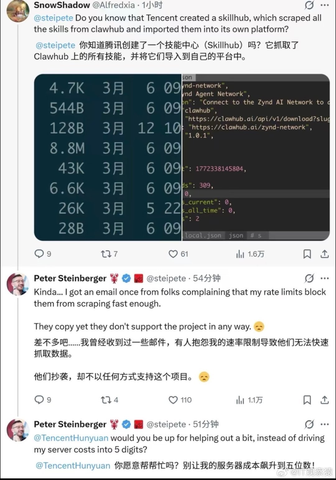 腾讯回应被龙虾之父指责抄袭腾讯:帮官方分担了流量,此外团队成员本身也是项目代码和PR贡献者,希望继续支持生态。
