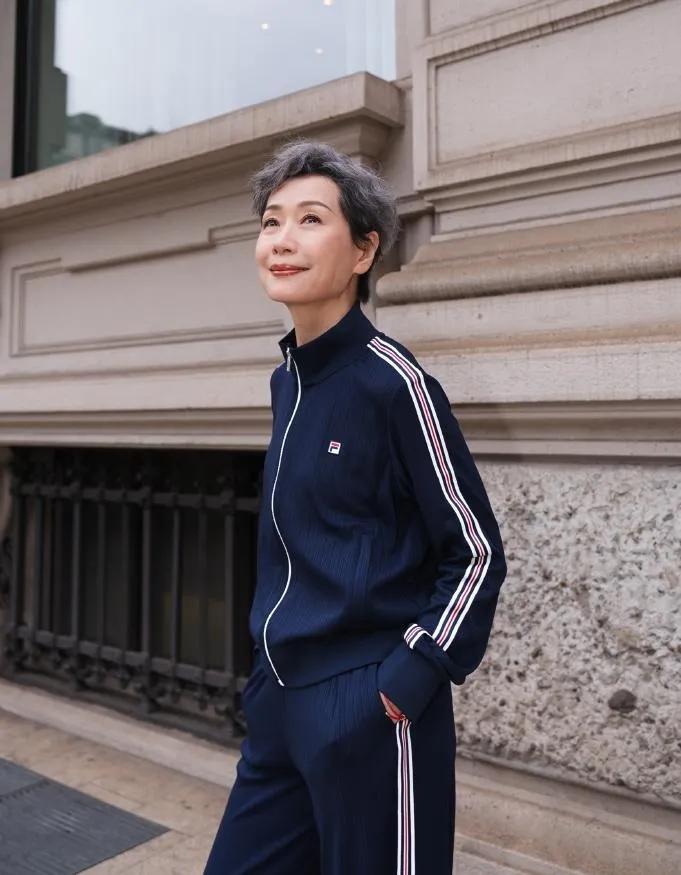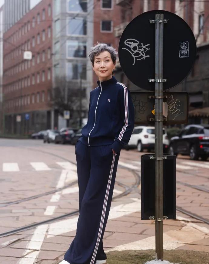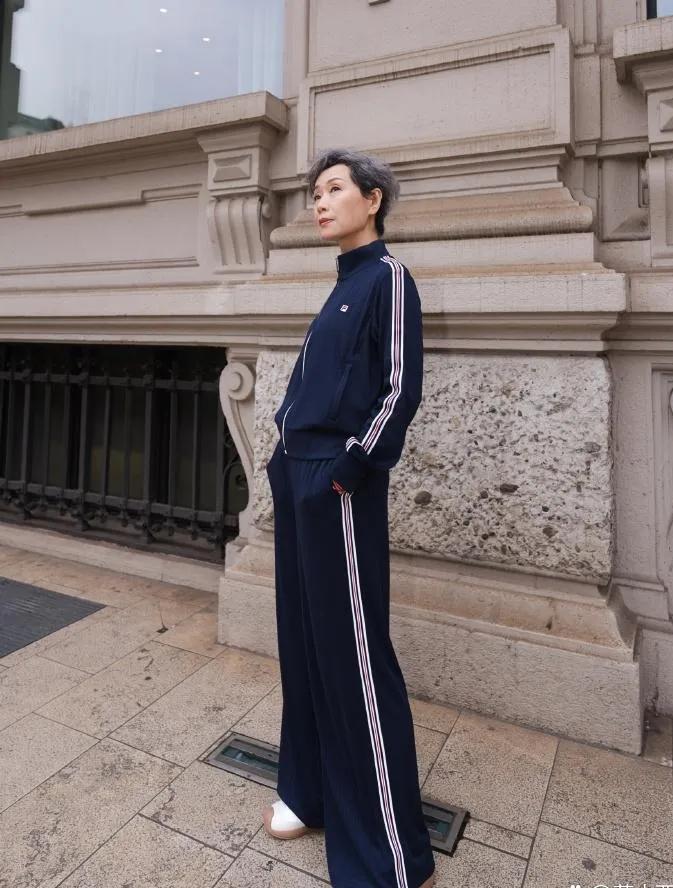 ✨叶童的老年穿搭太值得借鉴了! 一身藏青条纹运动套装,搭配德训鞋,舒适随性又显利