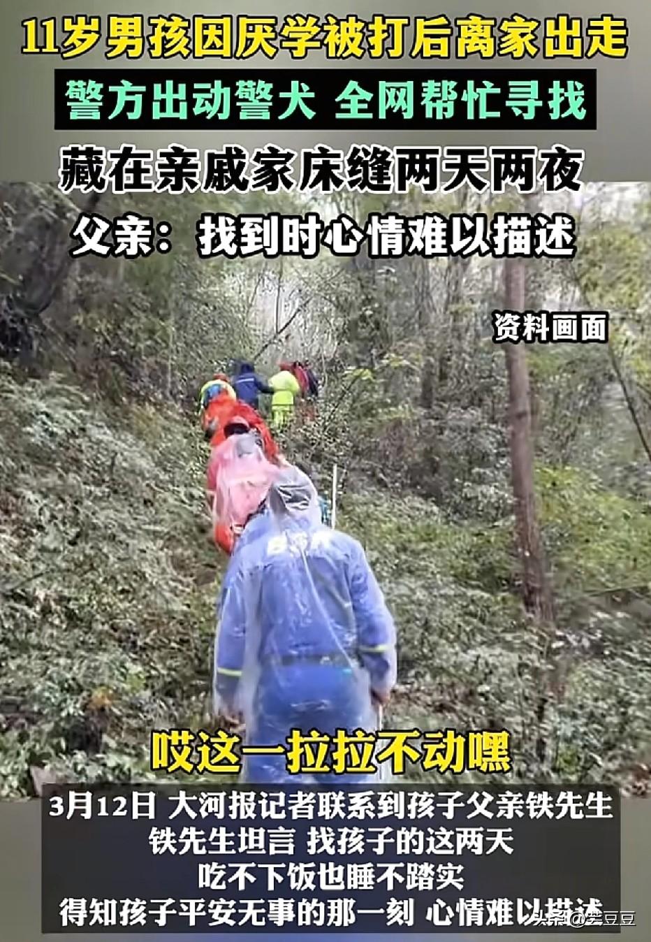 泪目,看得心太痛了! 河南平顶山,11岁的小男孩,因为不愿意上学,被父亲打了一顿。 谁能想到,这一巴掌下去, 孩子竟然直接离家出走,整整两天两夜不见踪影。 警方、搜救队、亲朋好友几百个人满山遍野地找, 动用了搜救犬,把附近能翻的地方都翻遍了, 家长的心都悬到了嗓子眼,腿都吓软了。 结果找到最后, 孩子竟然就藏在叔叔家的床缝里。 他就那么缩在窄窄的缝隙里,躲了两天两夜, 饿了渴了都不敢出声,只是默默地害怕、想家。 当父亲把他抱出来的那一刻, 父亲当场就哭了: “我真的不知道该怎么形容这种心情, 后悔、心疼、心酸,一股脑全涌上来了。” 他说,以后再也不会用打的方式教育孩子了, 会好好反思自己的教育方法。 哎,做父母的谁不爱孩子? 可有时候,气急败坏的一巴掌, 却比任何打骂都更伤孩子的心。 孩子不是怕上学, 孩子是怕你打完他之后, 觉得自己不被理解、不被爱。 11岁的娃,心里有多敏感、多脆弱啊。 他不是不懂事,他是在求救,是在躲避伤害。 夫妻之间、亲子之间, 沟通真的比打骂重要一万倍。 孩子能听懂道理,却承受不起无名的怒火。 你家孩子有过厌学、逃学、闹情绪的时刻吗? 你有没有过气得动手,事后又无限后悔的瞬间? (素材来源于大风新闻)