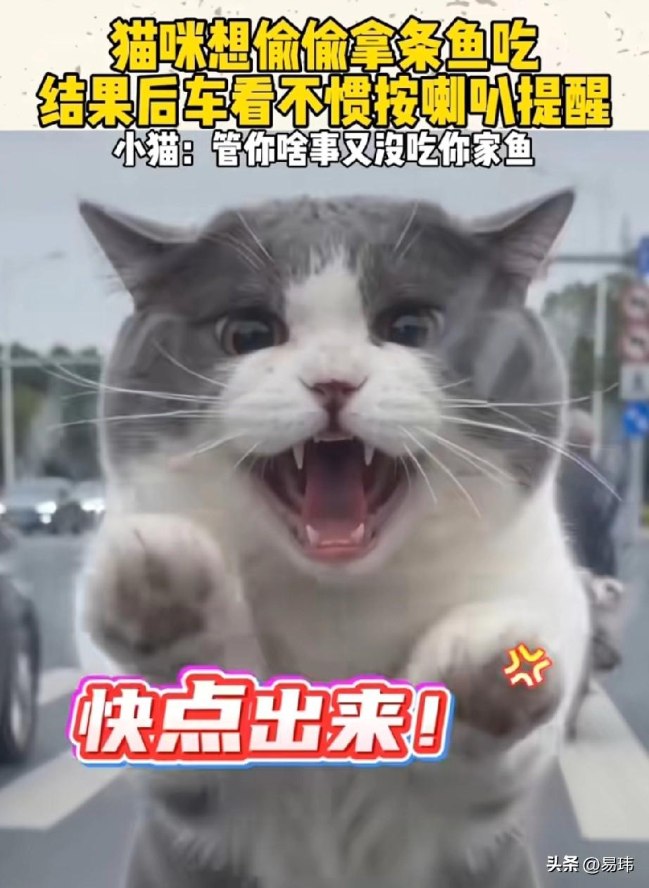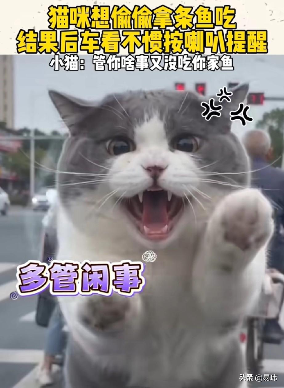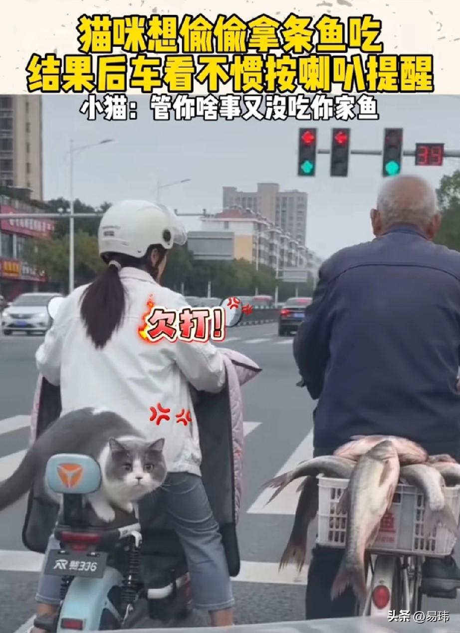 太搞笑了!这天一位小姐姐骑着电动车带着自己的猫咪去公园玩,当行驶到一个红绿灯路口的时候遇到了红灯,结果在等绿灯的时候,旁边一位老人也停在那里,这下可好了,猫咪发现了老人自行车的筐里装满了鱼。 贪吃的猫咪立刻探出身子准备偷拿一条鱼吃吃,结果就在它要得逞的时候,后面停着的一辆车突然响起了喇叭,吓得小猫一个激灵,这可不得了了,小猫怒火中烧,直接跳到了后车的车窗前,对着司机就是怒吼狂挠,幸好有玻璃窗,否则还不得被它直接伤到。 小猫就好像在那里骂他多管闲事,如果听的懂,一定知道它骂的有多难听。最终小猫只好跳回小姐姐的车上,失望的离去。