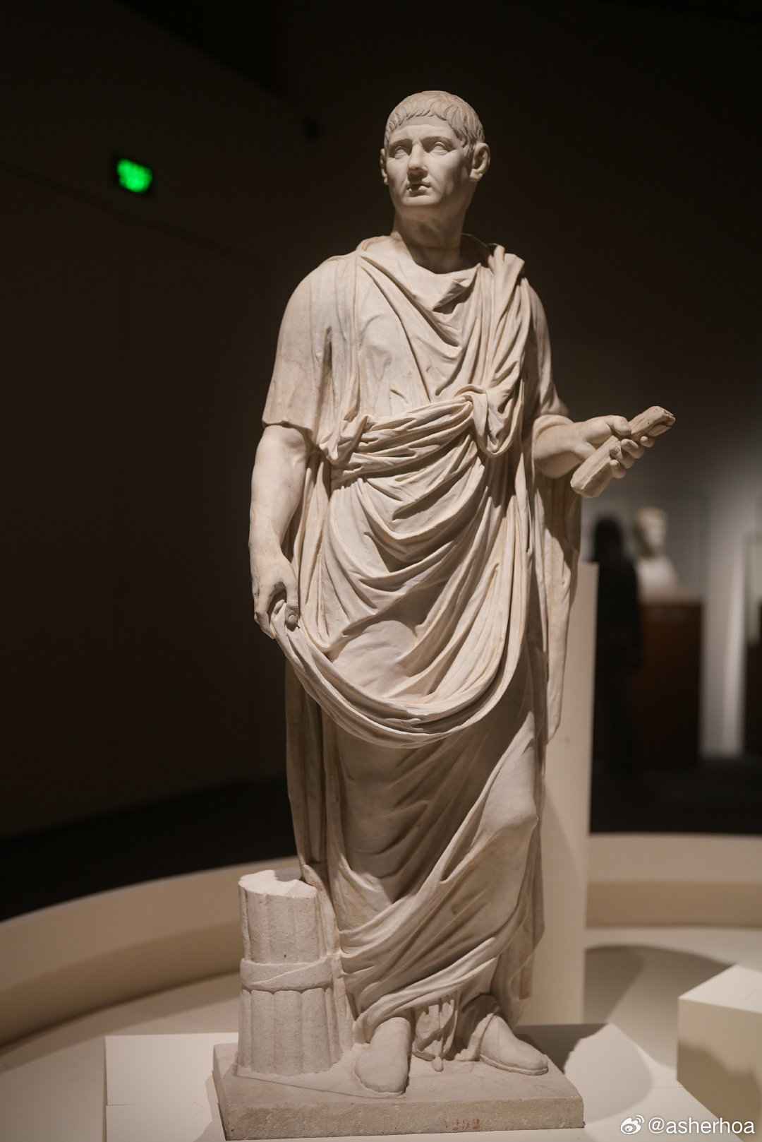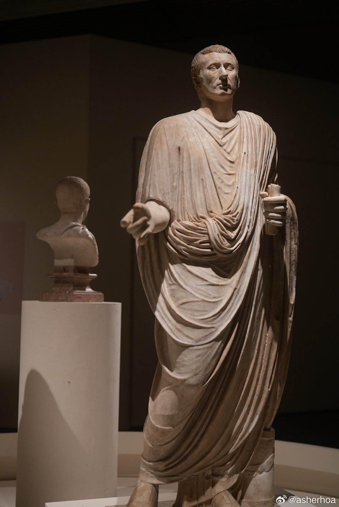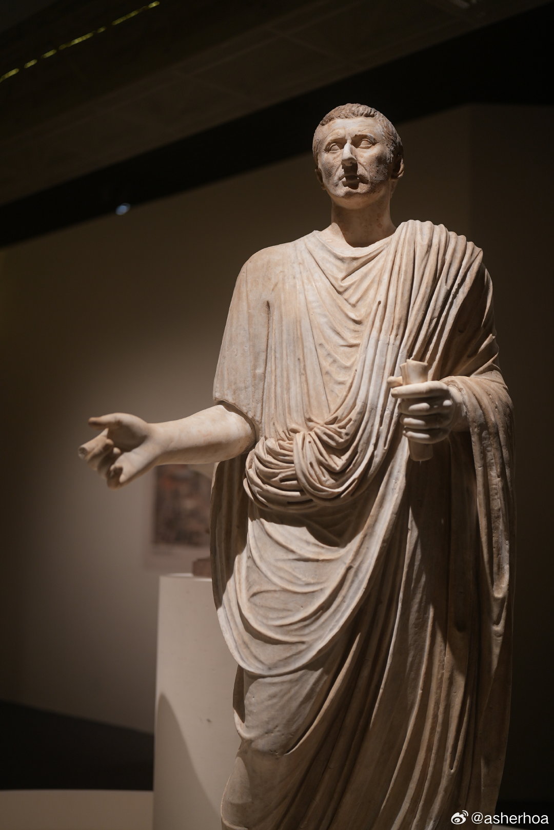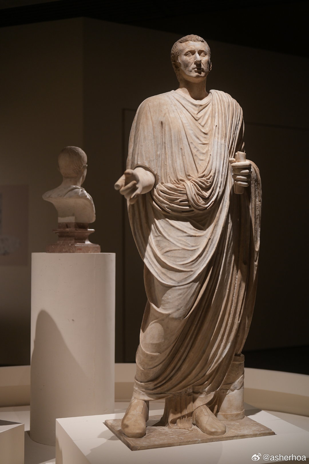 历史知识 博物馆奇妙之旅 国博的“叩问永恒”意大利庞贝古城文物展中的两位身穿托加袍的1世纪市政官雕像。第一位出土于庞贝,第二位出土于赫库兰尼姆(Ercolano)。赫库兰尼姆和庞贝一道于79年维苏威火山爆发中被掩埋,它规模较小(人口约5000),名气也不如庞贝,但发现更早,同时由于本身是当年罗马贵族的度假地,文物不乏精品。托加袍(Toga,亦称罗马长袍,图5)是罗马特色服饰,通常羊毛制成,长3.7米至6米,从左肩围绕全身。托加袍后来成为罗马男性公民的身份象征(非公民禁止穿着),女性则身穿类似的斯托拉长袍。