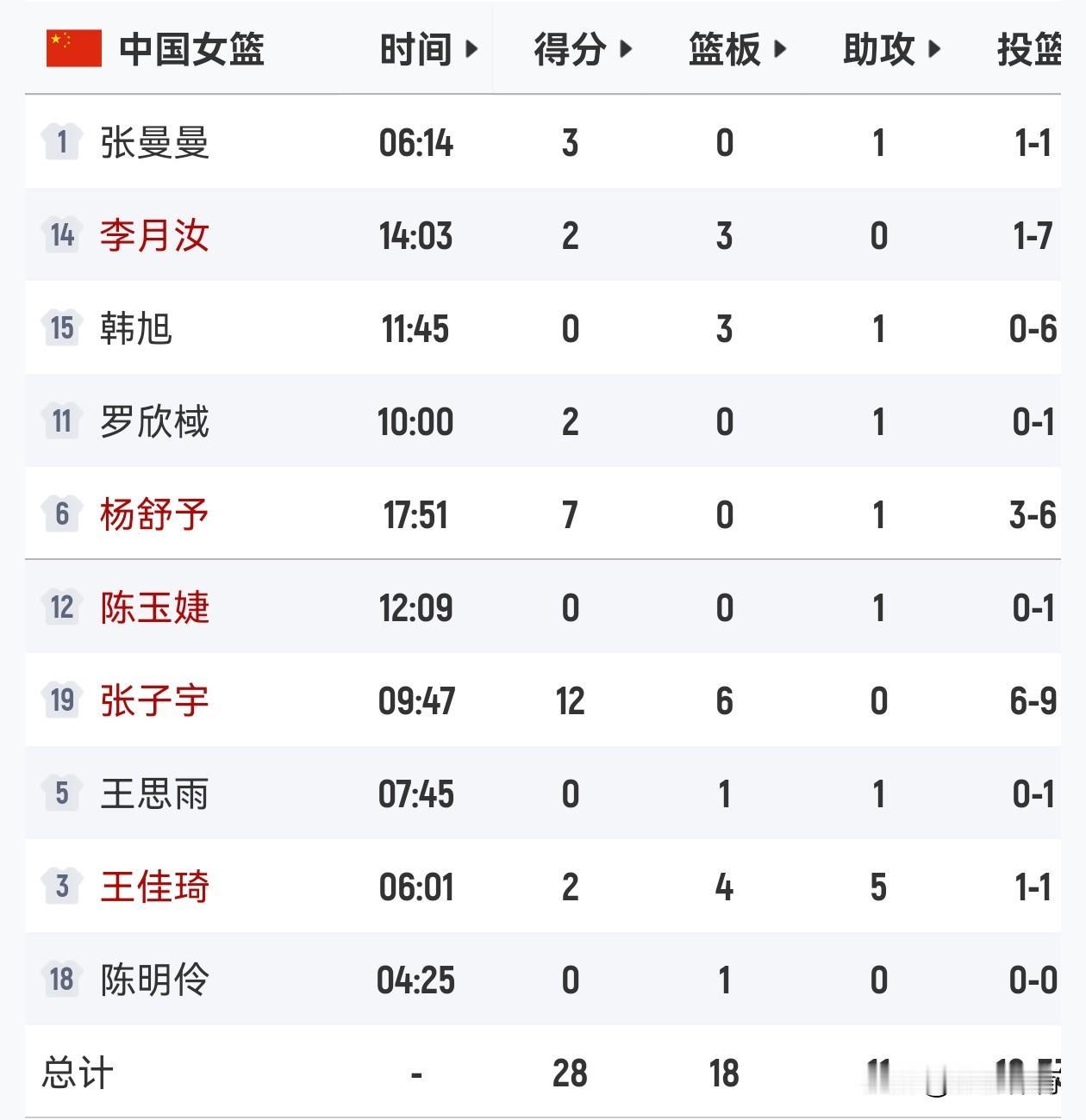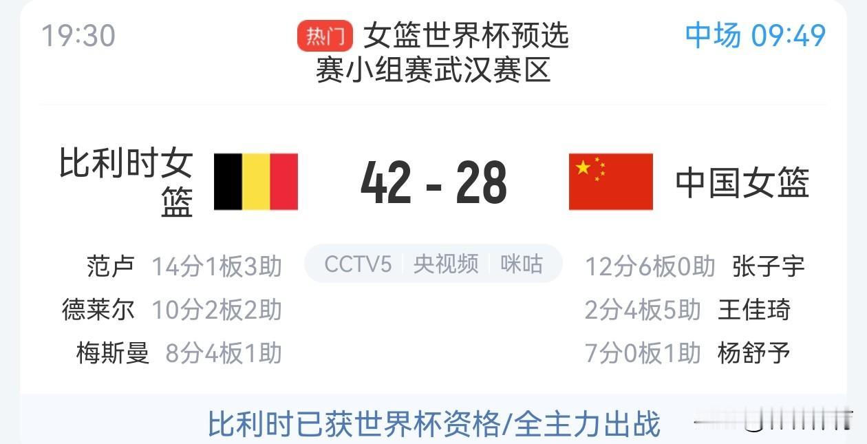 女篮世预赛小组赛武汉赛区,中国女篮第二场比赛上半场已经结束,本场比赛对于中国女篮来说是真正的考验,面对世界排名第五的欧洲冠军球队,中国女篮明显在节奏上以及临场发挥不如比利时女篮,半场比分中国女篮以28-42落后比利时女篮14分,中国女篮上半场发挥最好的是张子宇,得到了全队最高的12分6篮板,杨舒予7分,张曼曼3分,李月汝,罗欣棫,王佳琦各有2分入账,韩旭,陈玉婕,王思雨,陈明伶均有出场但是上半场都没有得分,半场比赛下来让我们无比怀念李梦以及刘禹彤,原因就是在比赛打不开局面的前提下,目前这支中国女篮没有任何一个球员有硬解能力,希望下半场比赛中国女篮利用中场休息,好好调整调整状态下半场打出中国女篮应有的实力水平。