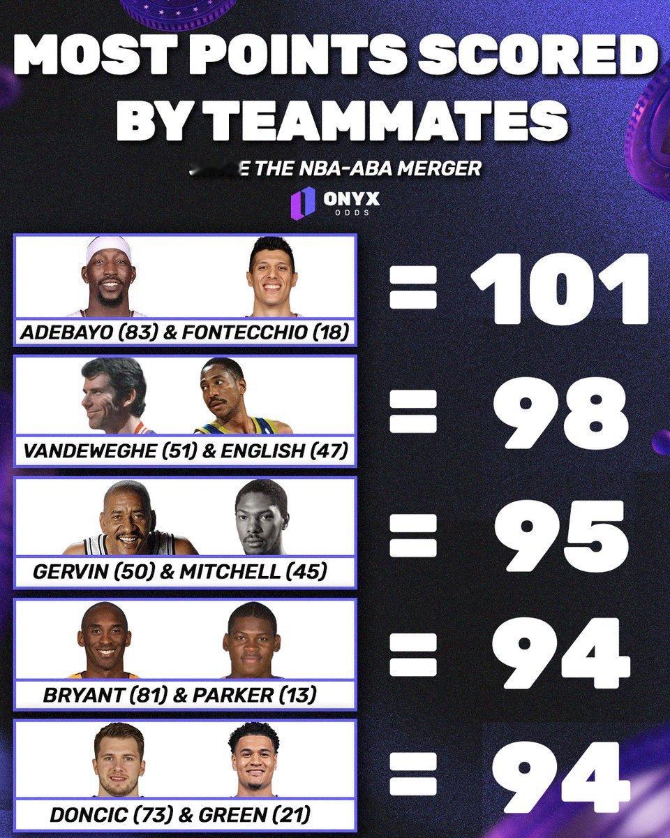 自从1976年以来,阿德巴约和冯泰奇奥创造了单场比赛“队友合计得分最高”的纪录排行!