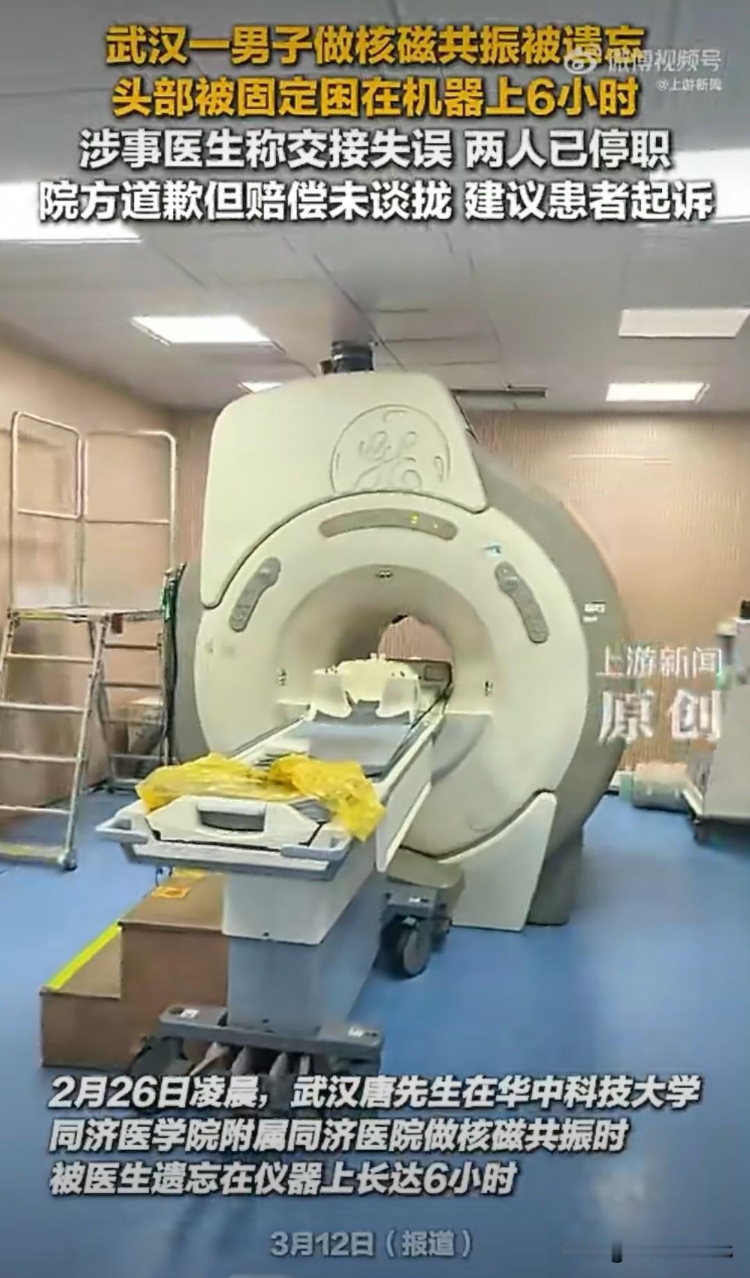 今天刷到个新闻直接头皮发麻,简直比恐怖片还离谱!武汉的唐先生半夜去医院做颈部核磁,本来顶多20分钟就完事的检查,结果硬生生被"忘"在冰冷的机器上躺了整整6个小时,从深夜熬到清晨,这谁能顶得住啊? 事情是这样的,2月25号晚上10点多,唐先生因为脖子疼去同济医院汉口院区检查,等了快两小时,凌晨0点才进了检查室。医生给他固定好头部、罩上面罩,叮嘱他别乱动,他就乖乖躺上去了,手机还放在旁边窗台上,心里还琢磨着做完赶紧回家补觉。 结果半小时过去,没动静;一小时过去,还是没人来!唐先生慌了,开始扯着嗓子喊:"医生在不在?""做好没?""有人在机器上啊!"可整个冷清的检查室只有核磁共振机器的嗡嗡声,喊破喉咙都没人应。他本来想自己下来,可听到机器还在响,怕乱动出危险,只能硬撑着,隔一会儿喊一阵,累了就歇会儿,反复折腾了整整6小时,嗓子都喊哑了,腿也麻得没知觉。 直到第二天清晨6点多,保洁员路过听到了他的呼救,叫来保安才把他救出来。更气人的是,医生居然早就离岗了,还在系统上误记他"已完成检查",交接出大漏洞,俩涉事医生直接被停职,科室也紧急整改了 。 咱就是说,医院是把患者当摆设了吗?6个小时啊!就算是块石头放那也该记着看看啊!更离谱的是院方后续的态度,道歉是道了,但赔偿谈不拢,居然还建议唐先生直接起诉,这波操作真的寒透了人的心。 有网友说,还好没出更严重的意外,不然后果不堪设想!也有人吐槽,这么低级的失误,到底什么时候能杜绝? 家人们,你们遇到过医院的离谱事吗?如果是你被忘在机器上6小时,你会怎么维权?