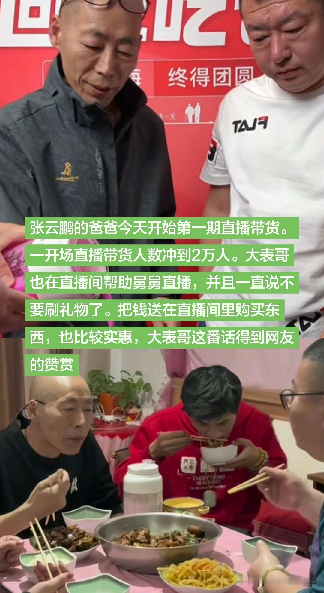 今天是张云鹏的父亲开启第一场直播带货。从早晨到晚上一天直播在线人数都是一两万人,销量还是不错的。 在直播间一直是张云鹏的父亲,因为张云鹏不能在直播间出现。开始是大表哥在直播间,因为衣服上面有LOGO,所以又用纸粘着。接着是二表哥也在直播间里面出现。胖哥也是很给力,在直播间里介绍的产品很详细。华生的产品是家用小家电,这一产品得被大家所熟知,所以说销量还是不错的。 这次张云鹏经济应该宽松很多。