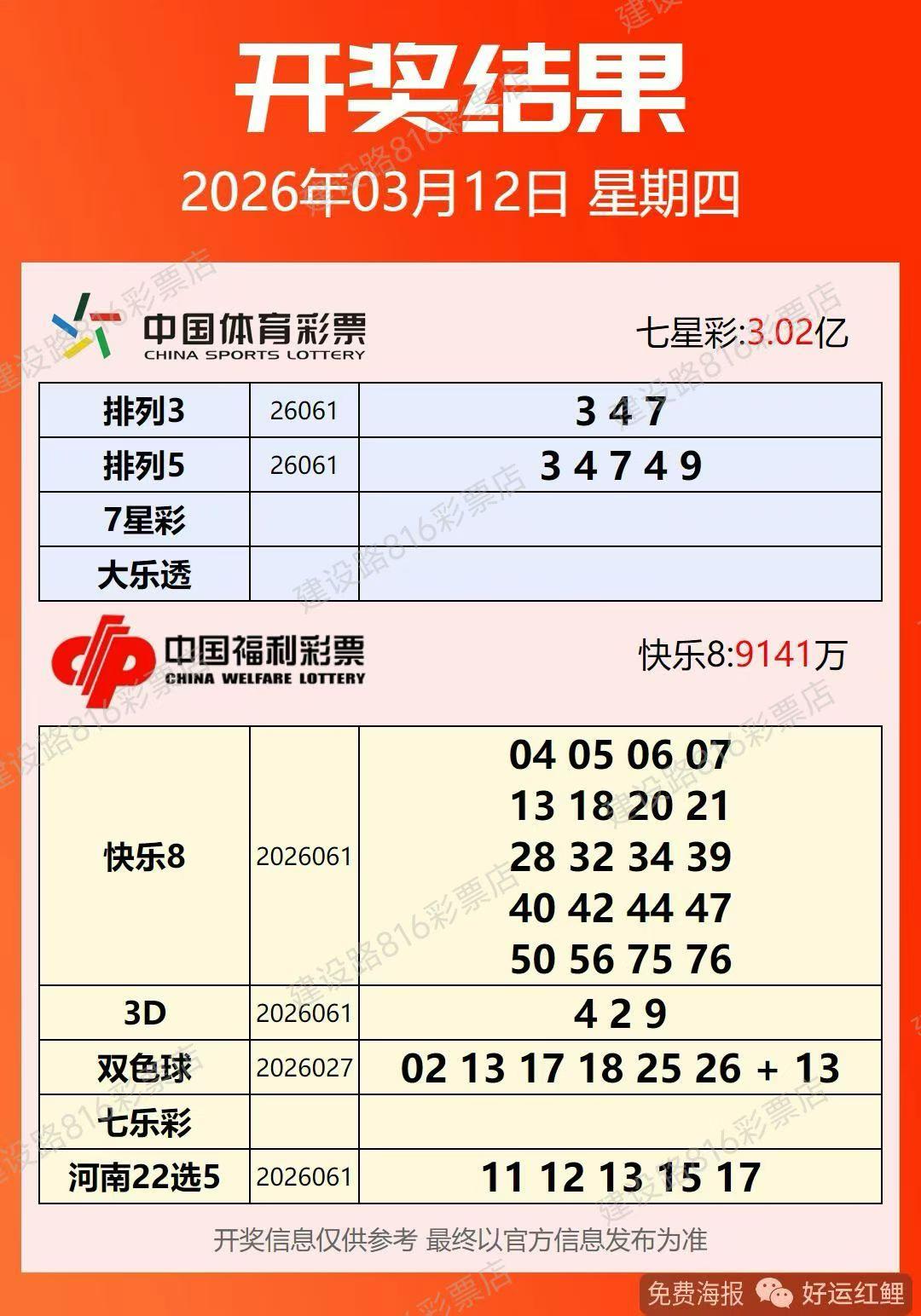 3月12号星期四,双色球开奖号码出炉:02、13、17、18、25、26—13。