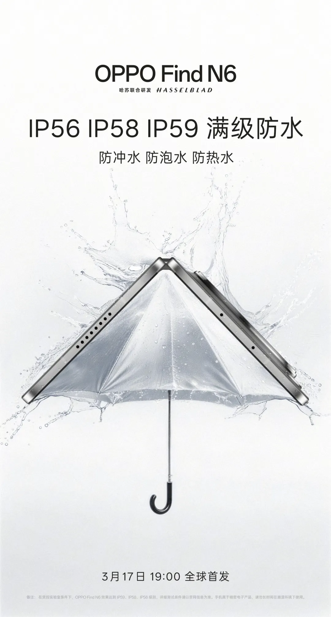 3月12日消息,OPPO官方今日继续预热FindN6折叠屏手机。新机将支持IP59、IP58、IP56满级防水和-20°C极寒耐用,宣称“冰天雪地放心开合”。据悉,该机以“无感折痕,久用平整”为核心定位,率先实现折叠屏核心技术量产突破,先于苹果将“无折痕折叠屏”推向市场,彻底打破折叠屏“脆弱易损”的行业痛点,重新定义高端折叠旗舰的耐用标准,其全球首发时间定于3月17日19:00。