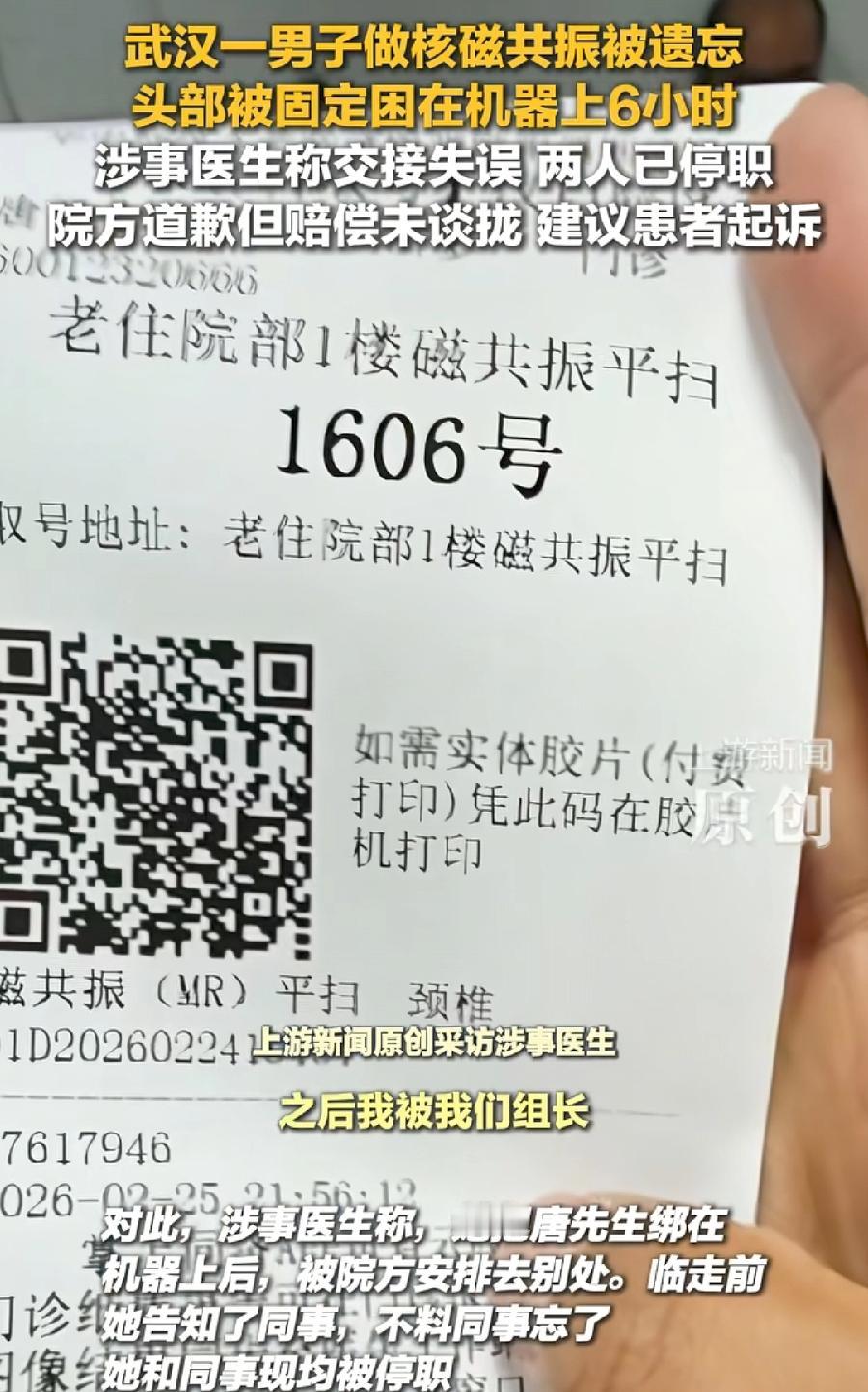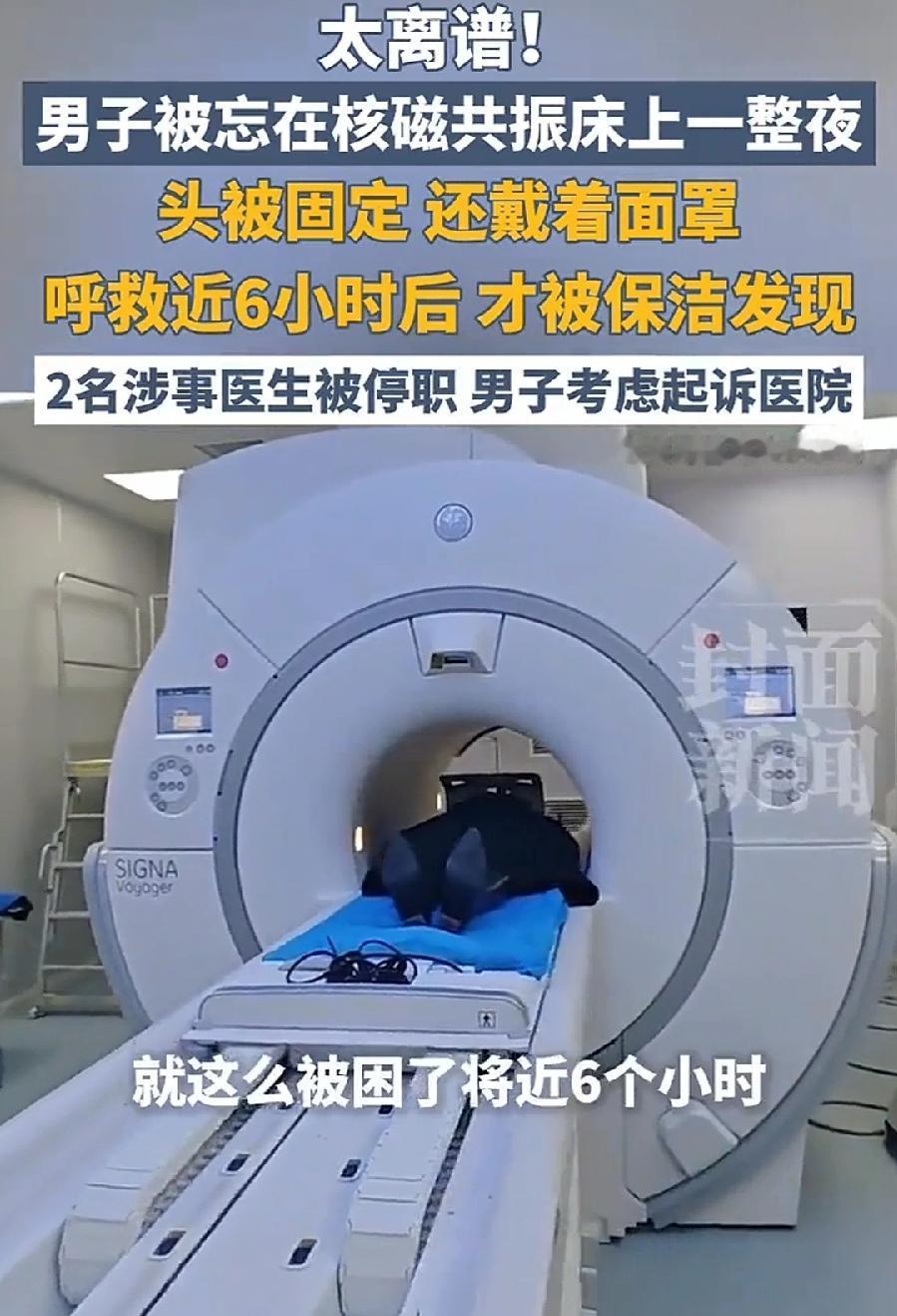 男子做核磁被遗忘困机器6小时,涉事检查医生说,那天是我把他绑上去的, 之后我被我们组长调到另一个部门去了,我走之后我交班了,另外一个医生了,我估计那医生到后半夜,肯定脑子忘记了,我到现在还是停职状态!那个人也停职了! 可见就是一个细节疏忽,给患者造成了这么大的痛苦,从凌晨到早晨6点,整整一个后半夜,半封闭空间被绑着,头被固定、戴着面罩,一动不能动,精神损失太大了! 目前双方谈判没谈拢,应该男子要的钱不少,医院建议走起诉法律程序,这也是没辙儿了,这事不算大,打官司太麻烦了,所以男子选择曝光,估计最后卫健委介入调解!希望妥善处理,也提醒警示每一名医护者,医疗无小事,做好每一个细节!