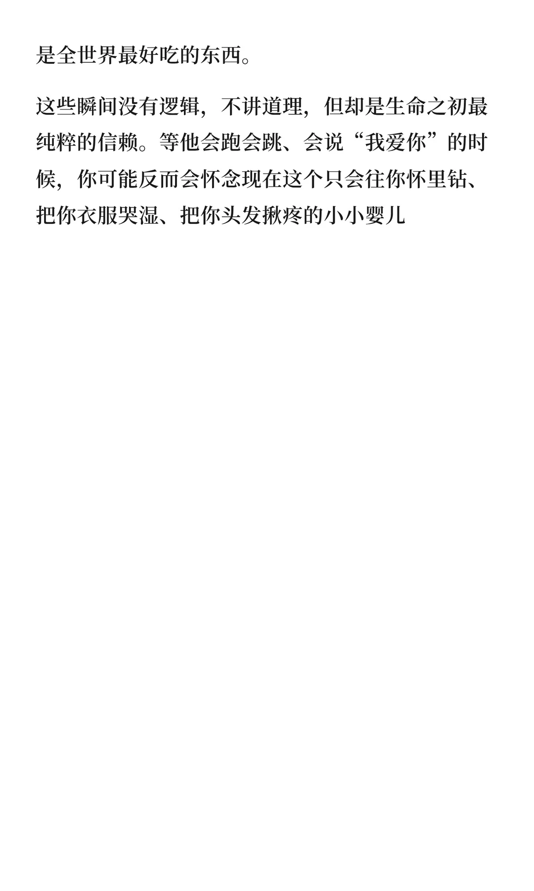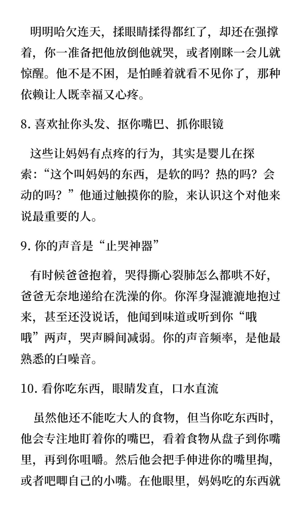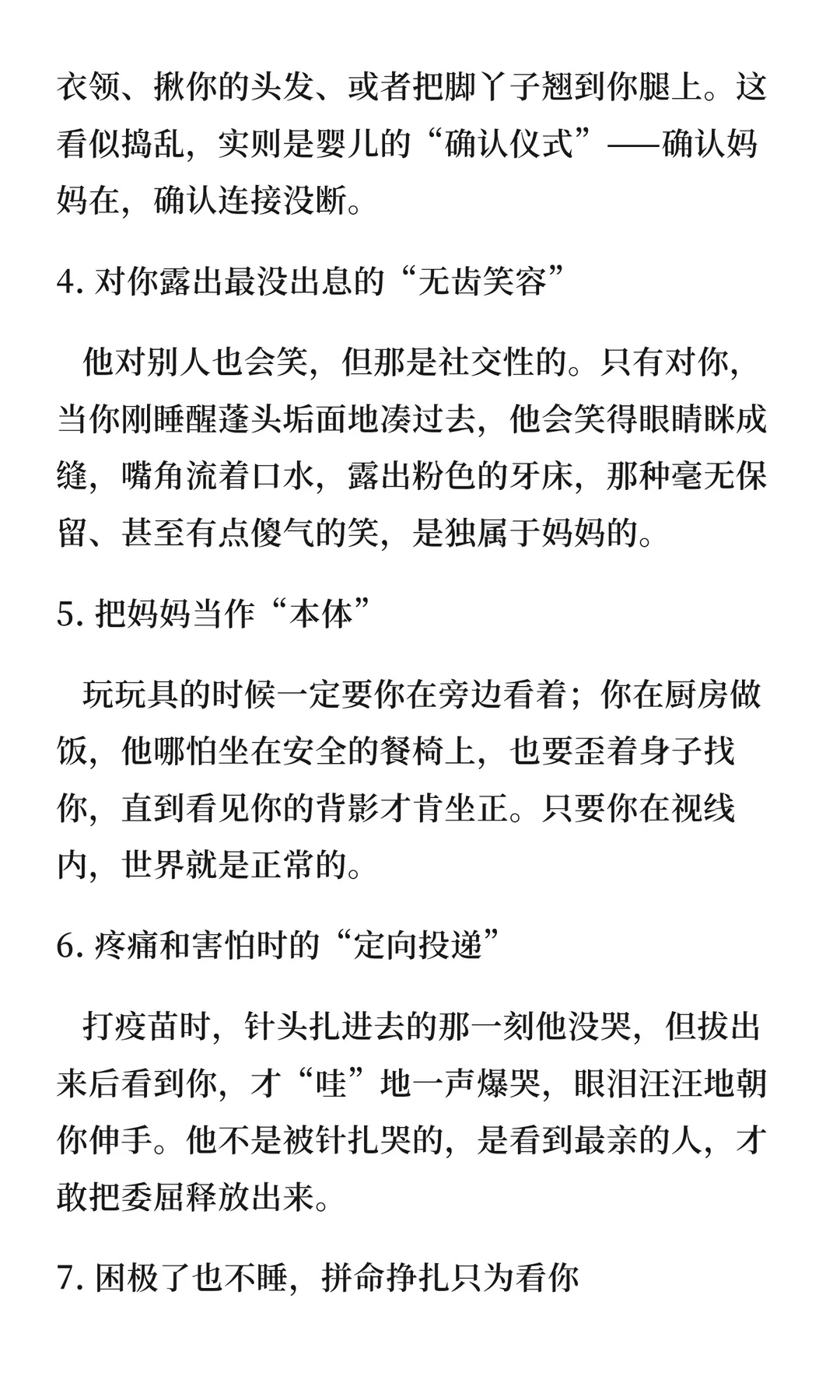 婴儿的爱藏在本能反应中,如闻妈妈气味入睡、目光追随、吃奶时抓妈妈、疼痛时寻找妈妈等。这些瞬间纯粹而纯粹,是生命之初最纯粹的信赖,值得珍惜。