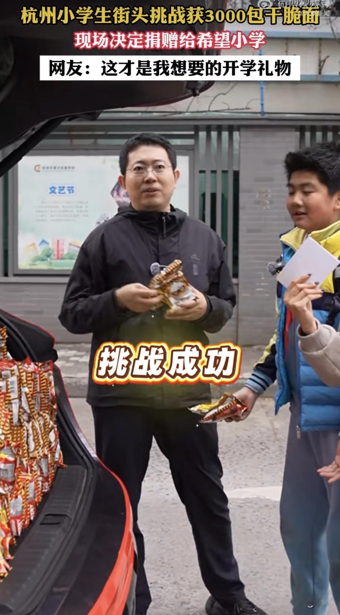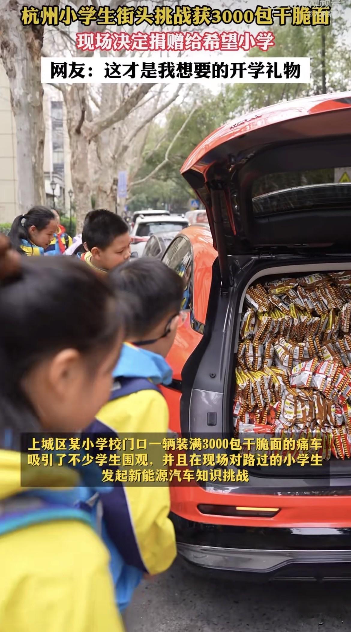 破防了。三千包干脆面堆成小山,六年级小孩看了一眼,说全捐了。 杭州上城区那所小学门口,开学那天停了辆痛车,车斗里干脆面摞得冒尖。新能源知识挑战赛,谁答得好,这三千包就归谁。围观的家长比孩子还多,有人小声嘀咕,这题大人都不一定答得上。 最后杀出来的冠军,是个六年级男生,姓郑。 主持人问电池续航,他连不同品牌的数据都能背。问充电桩分布,他给你分析市区哪儿最密。问环保原理,他从发电讲到回收,一条一条掰扯得清清楚楚。旁边几个家长手机都掏出来了,不知道是拍视频还是搜答案。 后来采访才知道,他家客厅柜子里,车模摆得整整齐齐,杂志摞得比书包还高。平时写完作业就翻这些,不是临时抱佛脚,是真钻进去了。他爸说,这孩子从幼儿园就喜欢车,别人看动画片,他看汽车评测。 三千包面到手,主办方问他怎么搬回家。他站在那没吭声,过了几秒说,想捐给希望小学。 现场安静了两秒。 有家长反应过来,小声跟旁边人说,换我家那小子,早盘算着怎么分给同学了。三千包,面包车得拉好几趟,够吃大半年的。 郑同学爸妈后来跟人聊天说起这事,也挺意外。孩子回家就说想捐,两口子愣了下,问他想清楚没。他说想清楚了,那边小朋友也能开心。当妈的后来跟邻居说,孩子自己想做的事,大人支持就行了。 但这事没那么简单。 有人问他为啥不留着自己吃,他想了下说,让更多人感受到温暖和快乐,特别有意义。这话从一个六年级小孩嘴里说出来,听着有点老成。但细想,他说的可能真是实话。 这孩子喜欢车,喜欢到什么程度?他爸说,有次去商场,路过新能源车展台,他在那站了俩小时,跟销售聊得人家以为他是同行孩子。回家还画了一堆充电桩分布图,说杭州哪些地方还不够。这种喜欢,不是玩玩而已,是真往心里去了。 三千包干脆面对他来说,可能真不如一本新的汽车杂志。 但这事还有另一层。 郑同学赢的那场挑战,问的全是新能源车的东西。电池、充电桩、环保原理,这些话题放十年前,小学生根本接不上话。但现在不一样了。有学校专门开新能源课,有企业进校园做科普,城里的孩子刷手机刷的是车评。 山里的孩子呢? 有网友扒出来,郑同学捐的那所希望小学,在西部一个县城。那地方去年才通上电,今年刚装了几台电脑。孩子们听说过电车,但不知道长啥样。他们印象中的车,还停留在镇上的三轮摩托。 同样是小孩,接触的东西差得不是一星半点。 三千包干脆面运过去那天,那边校长拍了张照片。孩子们围成一圈,看着那堆面,眼睛发亮。有人问,这是谁送的?校长说,杭州一个六年级学生,跟你们一样大。 孩子们愣了。他们可能想不明白,跟自己一样大的人,怎么能弄来这么多面。 这事传开之后,评论区吵起来了。 有人说这孩子格局大,将来有出息。有人酸是家里条件好,不差这三千包面。还有人较真,三千包听着多,分到一所学校也就一人几包的事。 但有一条评论点赞特别高:我们总觉得现在的孩子被惯坏了,动不动就攀比玩手机,其实有些小孩心里门清,啥该要啥不该要。 还有人说,这孩子的父母不简单。换别的家长,三千包面搬回家,够发半年朋友圈了。他爸妈愣是没拦着,还帮着联系学校找车拉货。这种家庭,教出来的孩子能差到哪去? 郑同学自己可能没想那么深。他就是喜欢车,从小喜欢到现在。记者问他以后想干啥,他说想造车。造什么车?新能源的,环保的,大家都能买得起的。 这话听着像场面话,但他说的时候表情特别认真。 三千包干脆面,说多不多,说少不少。但对希望小学那些孩子来说,这大概是新学期最惊喜的礼物。不是因为它有多贵,是因为送的人跟他们一样大,是隔着几百公里,有一个从没见过面的同龄人,想着他们。 有人开玩笑说,这小孩以后要是造车,广告词我都想好了:小时候赢三千包干脆面都要捐出去的人,造出来的车能差到哪去? 玩笑归玩笑。但有件事挺确定:这年头,喜欢车的小孩很多,懂车的小孩也不少,但赢了三千包干脆面转身就捐出去的,郑同学可能是头一个。 你们觉得,这孩子长大以后,真能造出他想造的那种车吗?