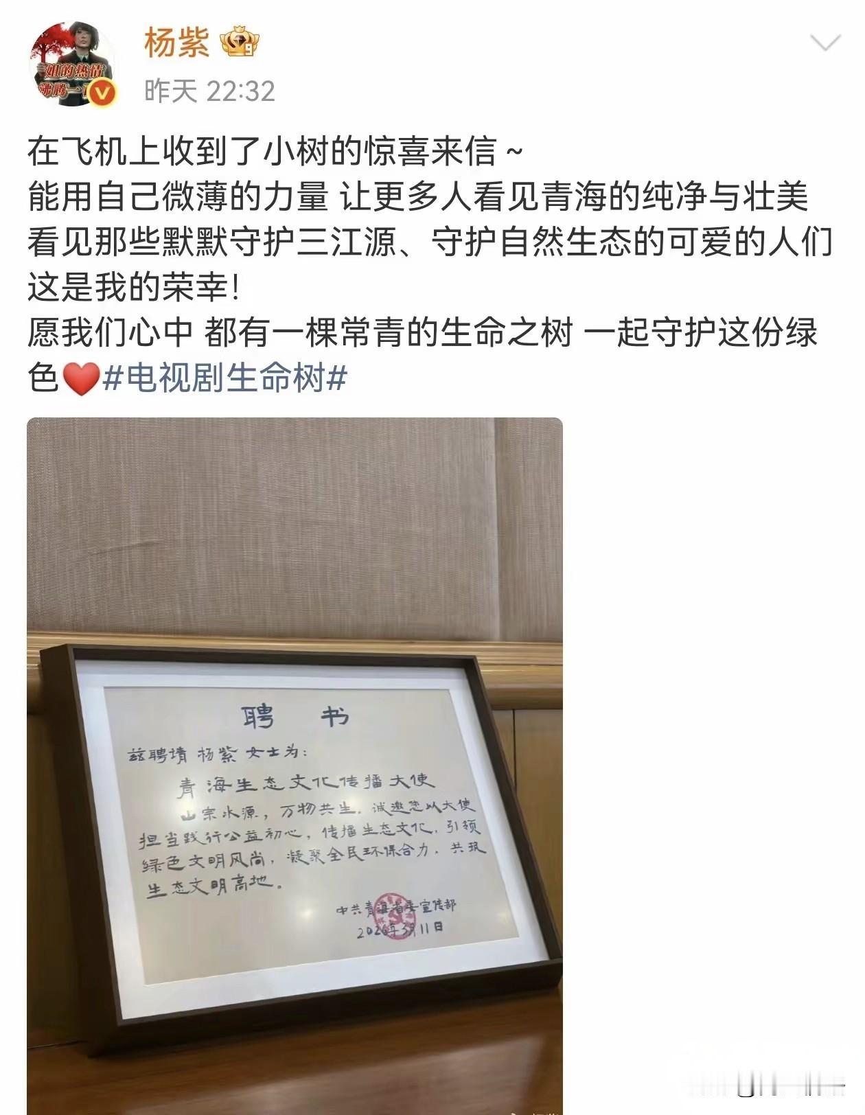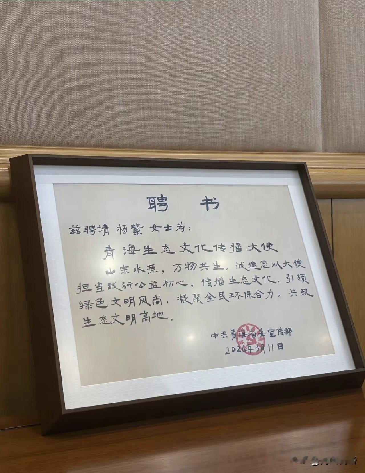 杨紫被正式受聘为青海生态文化传播大使。 3月11号深夜,杨紫在社交平台发文满是骄傲兴奋。 不少粉丝刷到动态的时候都是一头雾水,直到看到她晒出的那张红色聘书,才知道,她正式受聘为青海生态文化传播大使了。 3月11号晚上,杨紫结束了一天工作准备返程的时候,在飞机上收到这份来自青海省委宣传部的聘书,落地后的第一时间里面马上就分享了喜讯,字里行间满是荣幸,直言要尽全力让更多人看见青海的美。 其实这已经不是她第一次用行动传递正向价值,在这之前的《国色芳华》,剧中的牡丹元素直接带火山东菏泽、河南洛阳的花卉产业,鲜切花、盆栽销量一路飙升。 青海的三江源地区有着“中华水塔”的美誉,是长江、黄河、澜沧江的发源地,生态保护关乎着全国甚至到亚洲的生态安全,杨紫的加入,能借助她的国民度,可以让更多的人关注到这片净土的守护者。 《国色芳华》热播的时候,菏泽当地的花农都忙得脚不沾地,订单量都比往年翻了好几倍,甚至连带着牡丹文创、周边产品也成了抢手货,洛阳的牡丹园游客量暴涨,不少外地游客甚至专门的到这里来打卡剧中的同款花海。 杨紫选剧本时一直偏爱温暖治愈的题材,每个角色都传递着积极向上的力量,这次接下生态大使的聘书,也是希望把这份从荧幕里面来的温暖,播撒到现实的绿水青山中。 从荧幕明星到生态传播大使,杨紫的转变代表着越来越多的艺人的选择:不再是只追逐流量的光环,而是用影响力来反哺社会,这种身份的跨越,让明星的价值有了更厚重的底色。 但是这份责任也伴随着挑战,怎么样持续的输出真实鲜活的青海生态内容,怎么样带动更多的人来参与到日常的环保中,都是她接下来需要用心思考的问题,毕竟生态保护从来不是一时热度,而是一个长期坚守。 从带火地方特色产业到投身生态公益,杨紫一步步的把影响力落实到了实处,其实不止明星,我们普通人也能通过小事情来参与环保,就比如随手分类垃圾、节约水电,做身边的“生态守护者”。 “连夜收聘书还坐飞机上,这敬业感绝了,夸夸!” 不少网友都被这份真诚戳中,纷纷表示要跟着杨紫去了解青海的生态,为环保出一份力。 杨紫这波真的让人好感度拉满,没有什么高调的营销,只是默默的把事情做好。比起那些空喊口号的明星,她用实际的行动来告诉大家,偶像的意义就是带领粉丝一起变得更好,这样的明星活该被人喜欢!