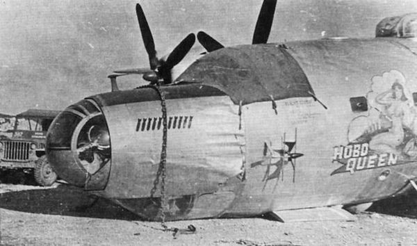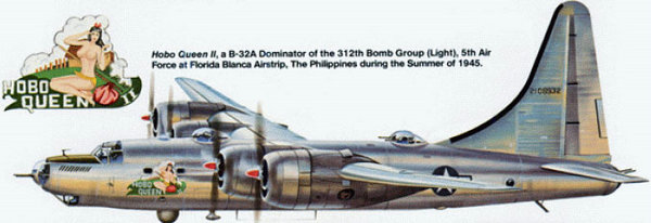 美国陆航第312轰炸机大队第386轰炸机中队注册号42-108532的联合B-32“流浪女王二世”号(Hobo Queen II),该机进行了美军在二战中最后一场空战,并声称取得了最后一次空战战果。 1945年8月17日,4架B-32在东京和横须贺上空侦察时遭到高射炮和战斗机的攻击。为了确认这是偶然事件还是表示日军将继续抵抗,18日又派出4架B-32沿头天相同的航线进行核实。两架飞机因机械故障提前返航,流浪女王二世号与另一架未命名的B-32继续前进,它们遭到了14架零式和3架紫电改(当时被美军机组误认为日本陆军的二式战)围攻。流浪女王二世号宣称击落了2架零式和1架紫电改,但未得到日军记录证实,另一架飞机上1死2伤,这是美军在二战中最后一次空战阵亡,两架B-32最后都成功返航冲绳。此事导致日本方面于19日拆除了所有战斗机的螺旋桨。 流浪女王二世号后来的运气不够好,在日本正式签署投降条约几天后,一名地勤因粗心操作,飞机在地面上收起前起落架,机头撞地受伤。在试图把它吊起的时候,一名起重机操作员又摔了它两次,机身严重受损,此后就再没修复。