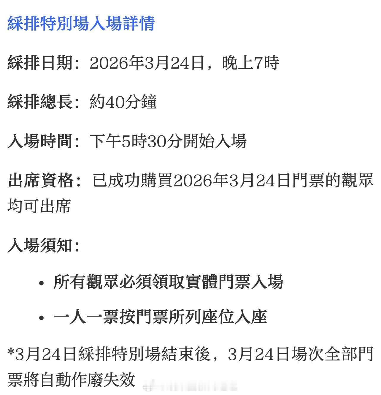 此次綵排為免費活動,不論觀眾是否出席3月24日綵排特別場,其所購買的2026年3月24日的門票票款及相關顧客服務費、郵遞費用(如適用),均可全數退款。亞洲天團五月天 早前宣布3月24日、25日及3月27日、28日在啟德主場館舉辦演唱會,惟臨近開唱卻突然取消3月24日「頭場」演出,改期至3月29日「五月天出道日」加開新場次。已購買3月24日場次的觀眾只能獲退票處理,相關安排早前引發部分歌迷不滿。