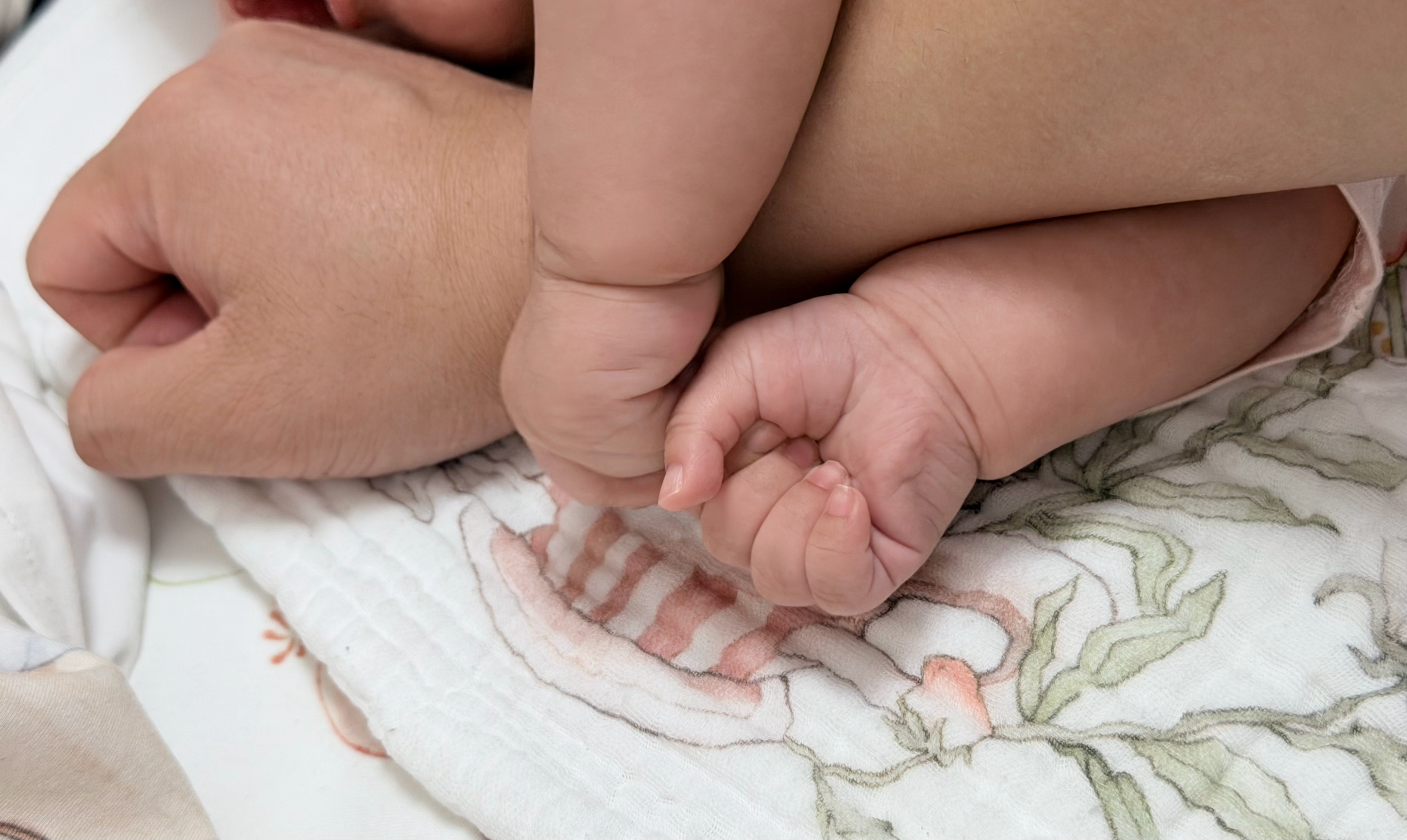 刚才小牙睡梦中一直在使劲要翻身。但是呢她自己还翻不过去,我在旁边看了半天,看的这个着急,就直接帮她翻过来了。