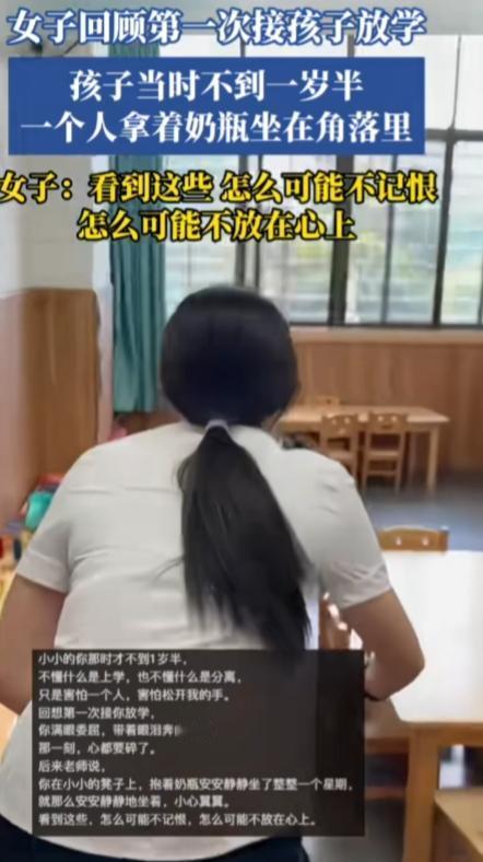 女子回顾第一次接孩子放学,孩子当时不到一岁半,一个人拿着奶瓶坐在角落里。女子直言