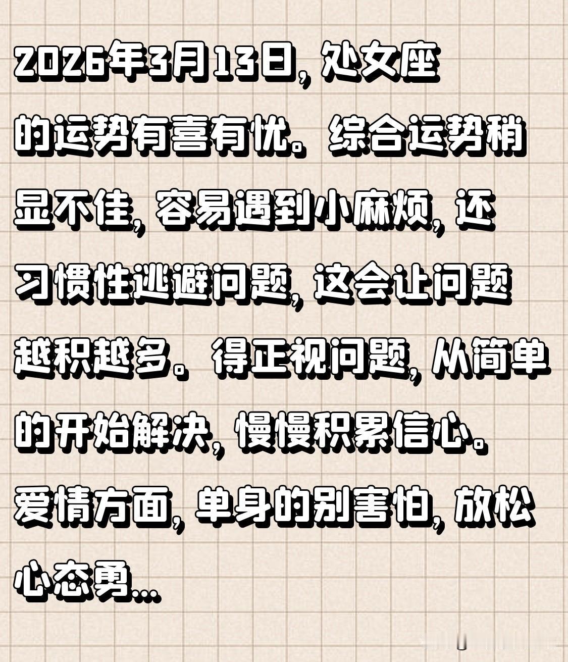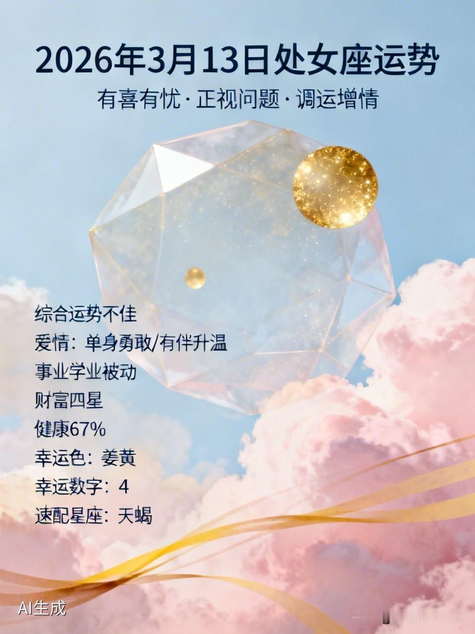 2026年3月13日,处女座的运势有喜有忧。综合运势稍显不佳,容易遇到小麻烦,还习惯性逃避问题,这会让问题越积越多。得正视问题,从简单的开始解决,慢慢积累信心。 爱情方面,单身的别害怕,放松心态勇敢尝试;有伴的要给感情升温,多关心对方、分享生活。 事业学业处于被动状态,缺乏主动性和积极性。 财富运势四颗星还不错。健康指数67%,要多注意。幸运颜色是姜黄色,幸运数字是4,速配星座是天蝎座。这天可得调整好状态,积极面对生活。