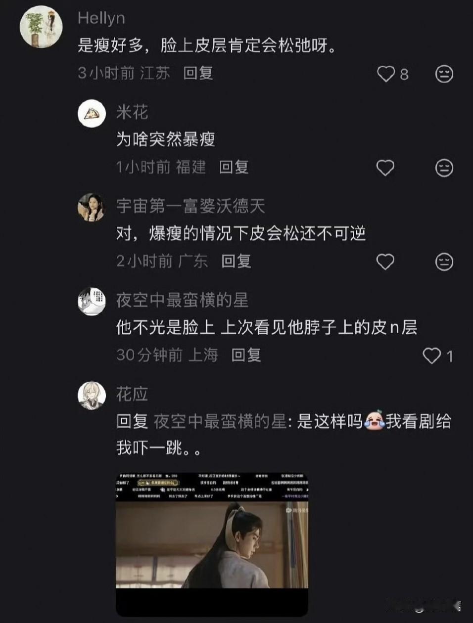 这就是减肥过度的代价吗?《逐玉》剧宣活动上的张凌赫,完全不敢大笑来着,实在忍不住的情况下,或是用手挡着,或是脸朝上“仰天大笑”,看着怪心酸。 而这,只因为减肥太猛瘦过头了,导致皮肉松弛,即暴瘦后面部软组织流失,但张凌赫凡笑得用力了点,就会一脸褶子,那边贾玲也是这么个情况,以前笑起来是憨态可掬,自带感染力,如今再笑则是盖不住的褶皱感,这也解释为什么她瘦下来后变得高冷不爱笑。 作为艺人,形象管理非常重要,如何以最好最美的状态出现在镜头前,是娱乐圈心照不宣的准则,偶像包袱之下,直接关联的是商业价值。 只能说,鱼和熊掌不可兼得,短时间暴瘦不可取。