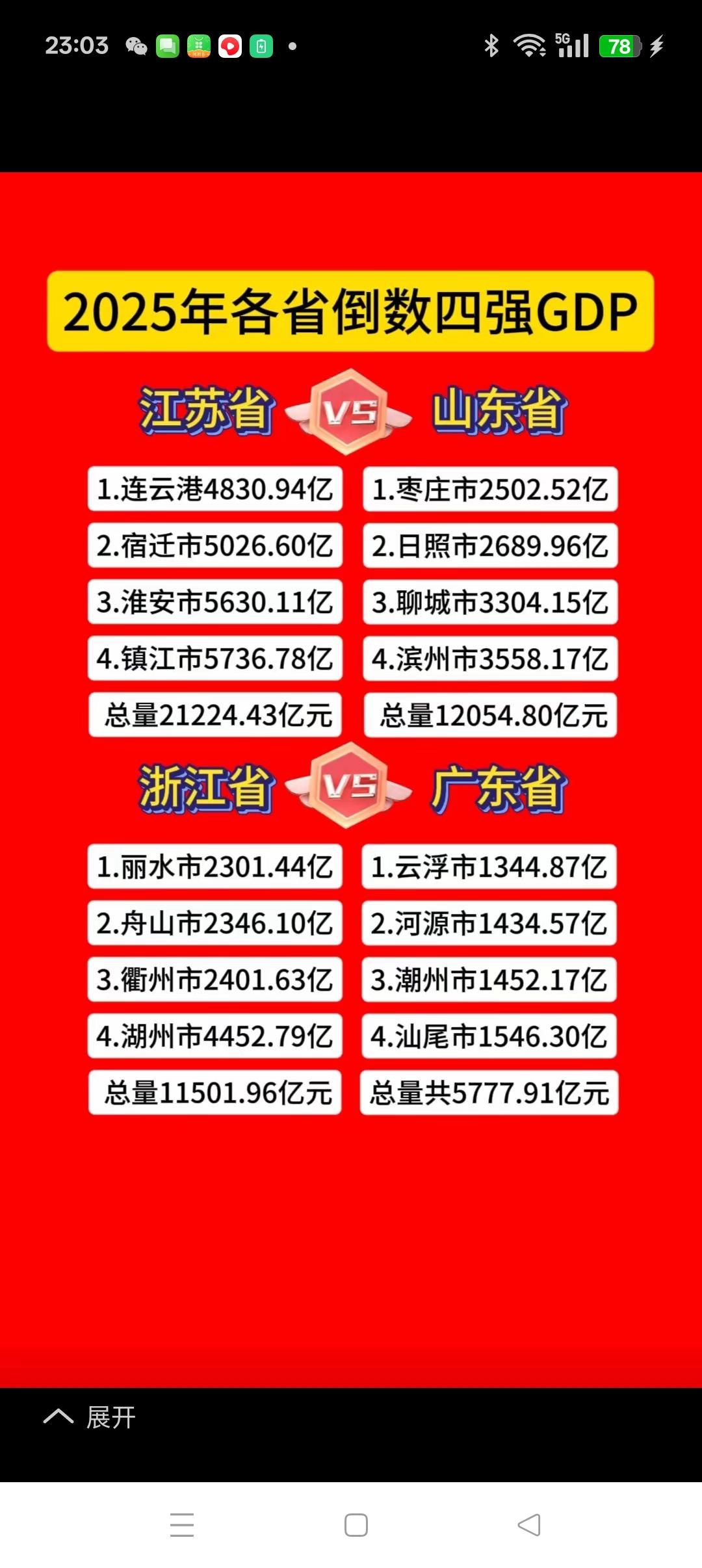 广东与江苏最大的差距在于均衡发展 广东是全国经济第一大省,GDP总量全国第一,江苏一直位居第二,但广东与江苏的最大差距却在于均衡发展方面,至2026年底,广东也只有深圳、广州、佛山、东莞四大GDP超万亿的城市,而江苏GDP超万亿的城市将达到6座。 而广东除了上述4座城市GDP总量较高外,其它17座城市的GDP水平则普遍较低,江苏的苏北尽管与苏南有一定的差距,但近年来苏北的GDP增速却明显快于苏南。江苏的13个城市全部进入全国百强城市榜单,全国独此一省,江苏是全国均衡发展做得最好的省份。 特别是江苏GDP排名最后的四座城市与广东排名最后的四座城市相比,真是一个天上,一个地下,广东这四座城市的GDP总量只有江苏这四座城市GDP总量的27.2%,只相当于江苏镇江一个市或苏州下面的一个县级市(昆山)的水平。 因此,尽管广东在GDP总量方面还保持着全国第一的位置,但在均衡发展方面,与江苏的差距却很大。加油!广东!