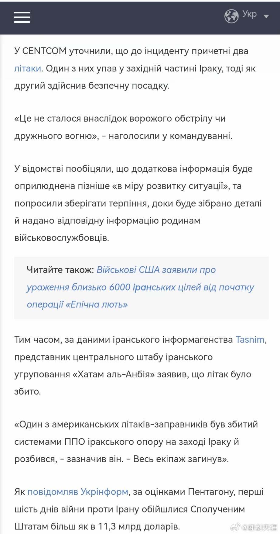 “美国中央司令部报告一架美国KC-135加油机失事。“事件发生在”史诗狂怒行动“期间的友军领空,救援行动仍在继续,”军方表示。