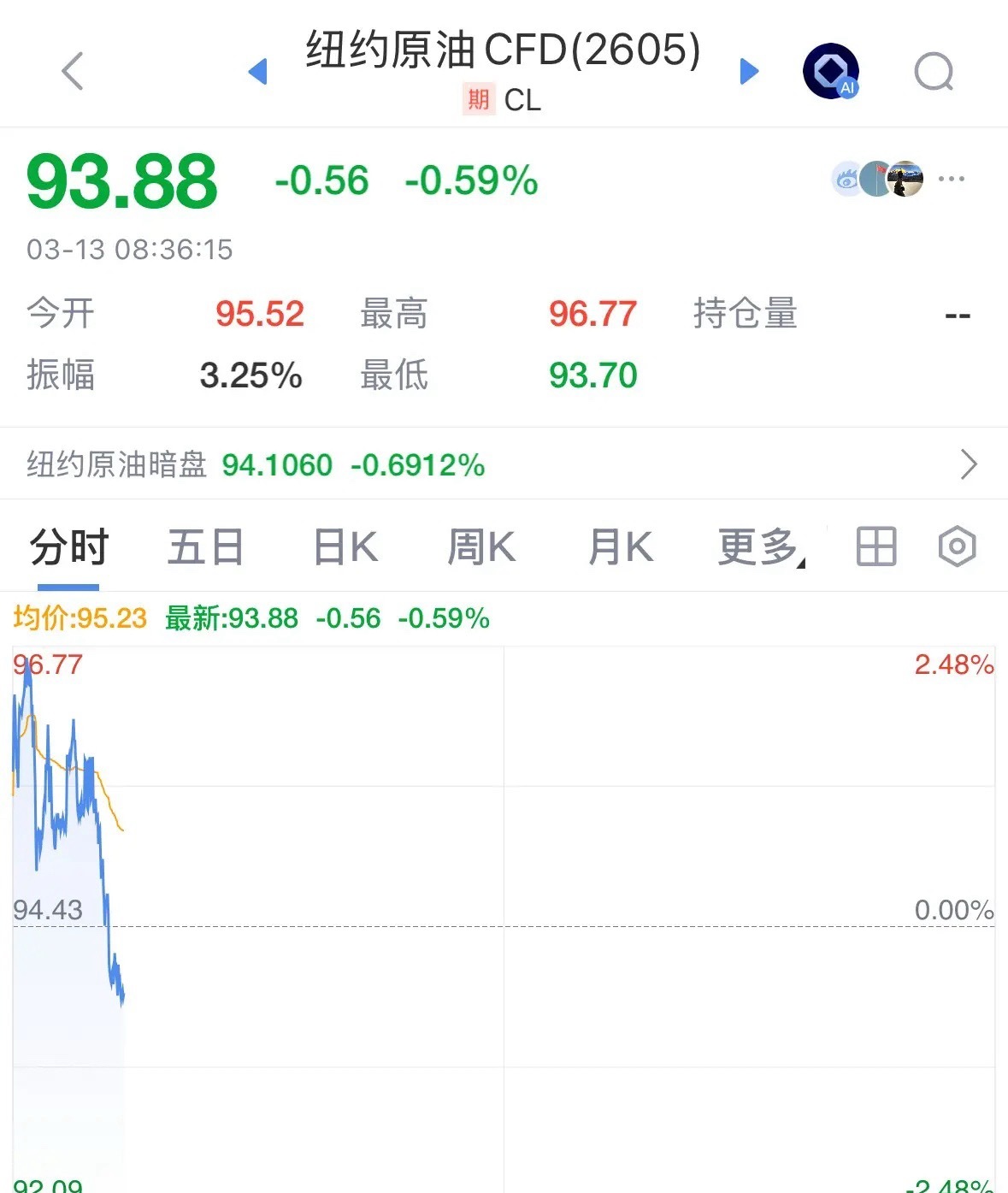 利好消息国际原油今天早盘高开低走下跌,强弩之末投资者注意追高风险:不要追高,不要追高,不要追高!重要的事情说三遍,有的人还在看着昨晚的消息想追高油气板块,今天必然高位被套!3月13日最新利好消息,国际油价今天早盘高开低走,跌破了94美元,走势趋势见顶,已经是强弩之末,投资者注意追高风险!而且,油价涨股票不一定会涨了,更要注意追高风险!CPO等高科技板块大跌不用杀跌,依然是抄底机会,美股纳指期指已经开始上涨了,不信点赞关注验证!建议允许公积金直接抵首付还房贷