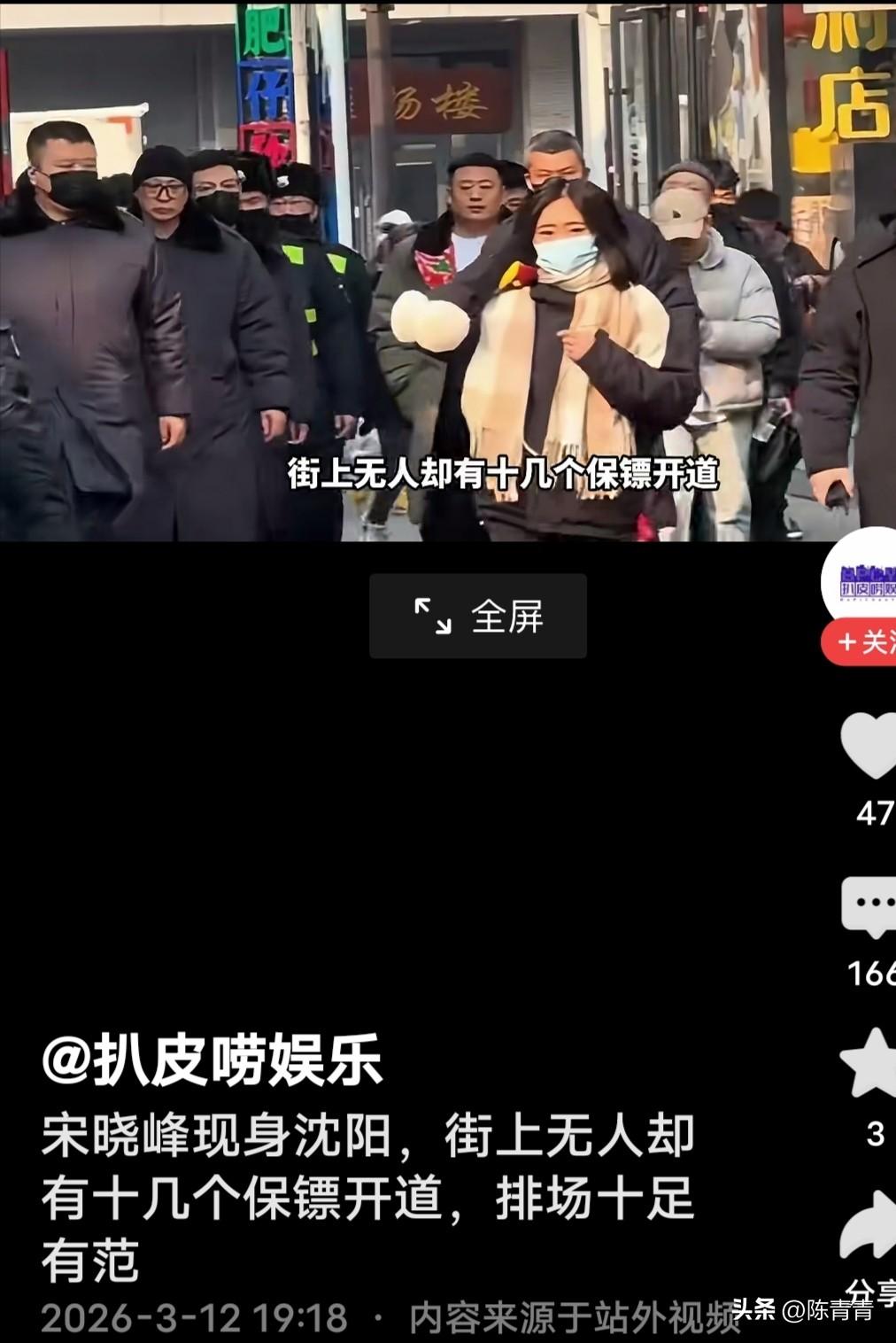 宋晓峰咋还飘了呢?2月11日的东北沈阳,天气寒冷,街上没有啥人,宋晓峰带着十几个保安浩浩荡荡炸街。这是给谁看呢? 二人转演员宋晓峰,给人的印象憨厚老实、滑稽搞笑,特别深受东北人欢迎。咋了,人出了名都这样吗? 大街上就没啥人,宋晓峰来了,那场面好气派。美女带路,十几个表情严肃的保镖围着,宋晓峰被众星捧月似的。 有网友说,“这应该是主办方搞的事情,请人花钱了,造造声势,不是怕粉丝拦,而是怕没有粉丝。” “不接地气,永远成不了气候。作品里所有的表演都是给人看的,现实才是真实的。” “演艺圈的工资太高,怎么不加重税呢?人钱不能太多,太多容易飘。” 一个演员出行整这么大动静合适吗?
