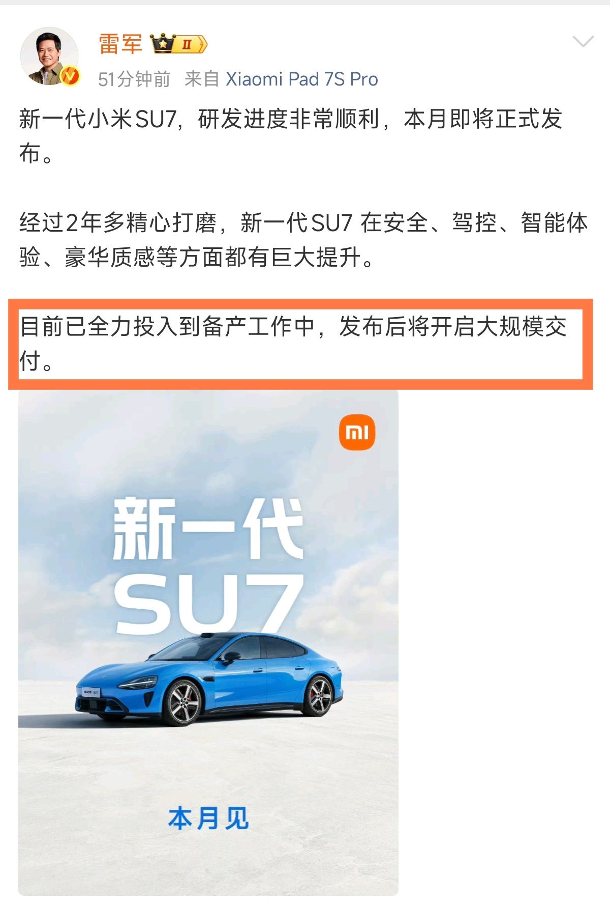 雷军宣布:新一代小米SU7本月发布,发布后将开启大规模交付。