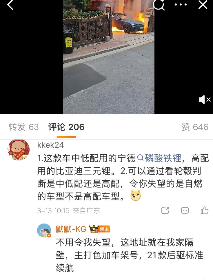 这个车,博主又说都有车架号确定是标准版,那就是用的宁德时代的电池,但是又一直说比亚迪的三元,给人一种强烈的暗示,即这台车就是因为采用了比亚迪的三元电池才会着火!