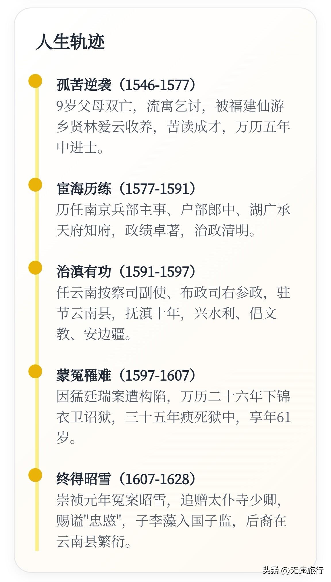三十一年冤狱与三段曲折人生 明万历云南参政李先著的孤勇传奇 李先著的一生 是明代寒门士子逆袭 边疆官员履职的缩影 更是忠直之士对抗官场黑暗的悲剧写照 他始于孤苦 凭借义父的抚育与自身的勤勉 跨越阶层成为进士 他成于仕途 在中央与地方均有政声 以云南县为核心治所抚滇十年 兴水利/倡文教/安边疆/福泽一方 他冤于官场 因坚守初心/拒绝贪功 遭同僚构陷/瘐死诏狱 他终于昭雪 历经三十一年 其忠直与功绩最终被历史铭记 他身后凄凉 一棺浅土/遗孀无以糊口 独子李藻贫不能归 流寓云南县而繁衍成族 成为今日祥云李氏之祖