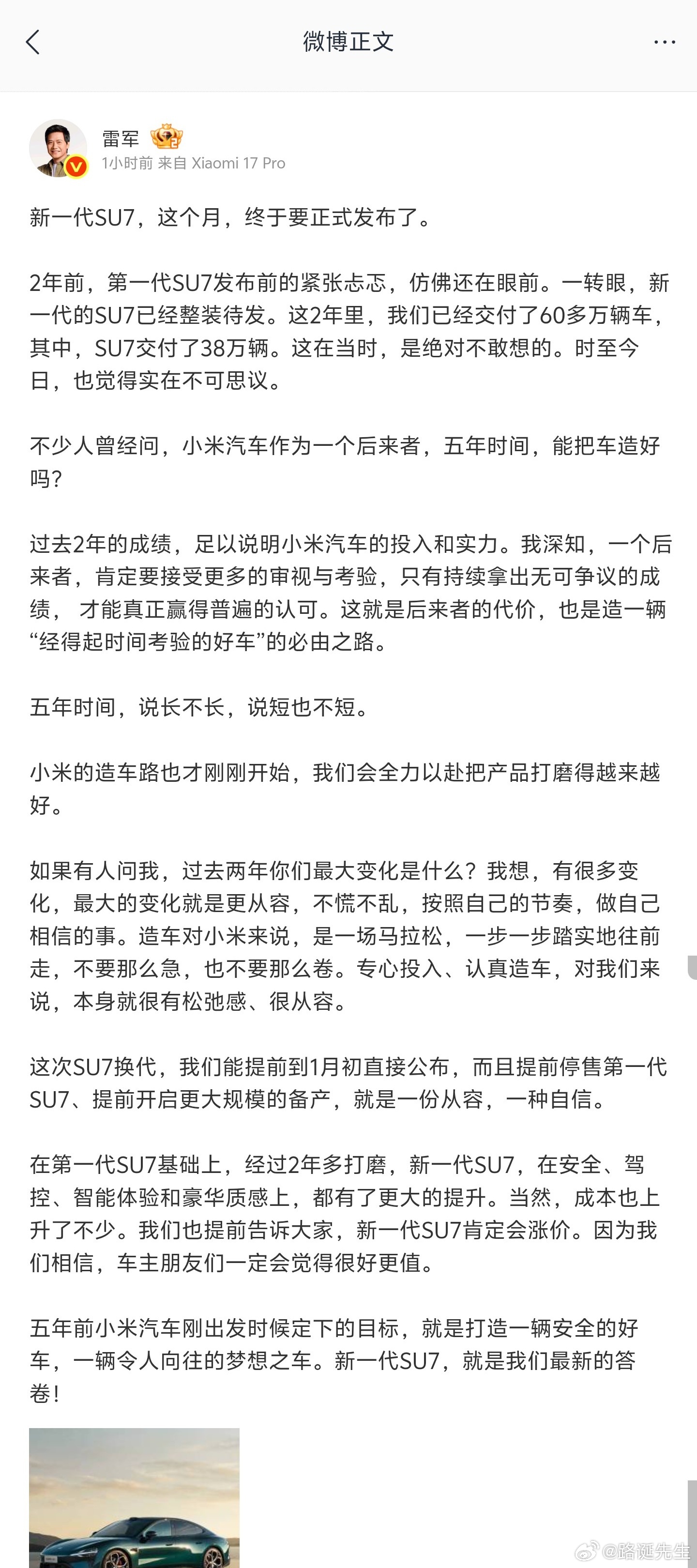 雷军表示新一代SU7确定涨价预售价只涨1-1.4万,这种略微涨价是没问题,是符合预期的,都是大家想得到的,道理很简单,因为相比上一代,新小米SU升级的地方很多,设计更合理,产品更完善,打磨更完美,优化更进步,从哪个方面看,只涨价一万多,都是非常良心的。