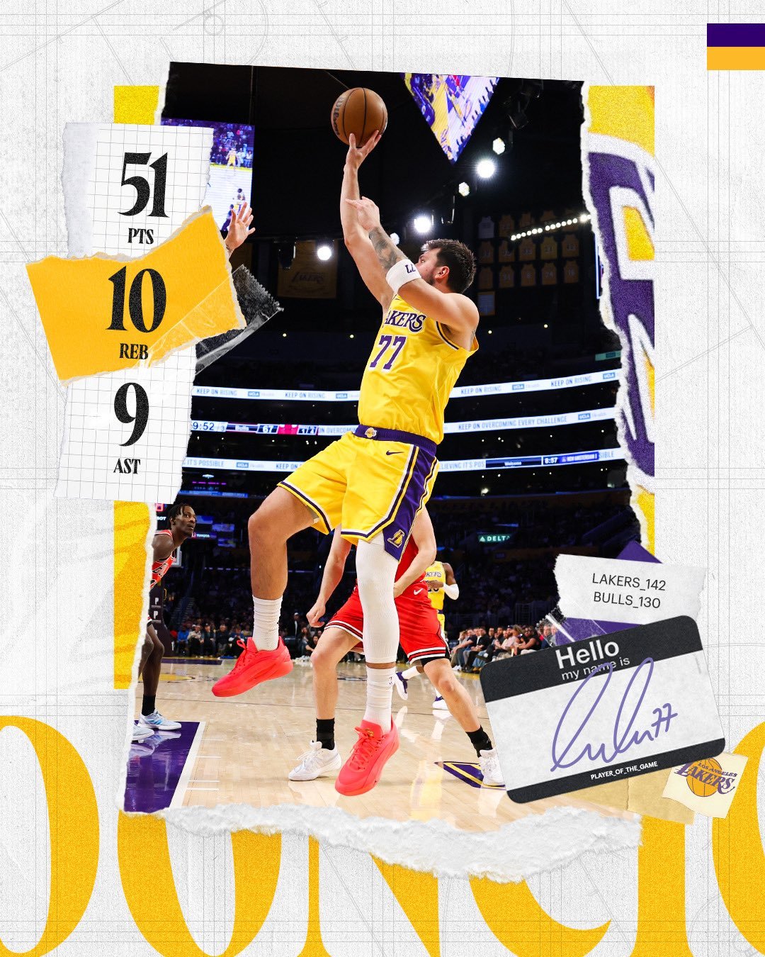 ✅ 湖人战胜公牛 取得四连胜✅ 东契奇全场51分 创湖人生涯单场得分新高✅ 里夫斯职业生涯总得分突破5000分✅ 艾顿23+10 贡献两双✅ 八村全场上场时间最多 拿下15分湖人国度LakeShow湖人战胜公牛东契奇51分准三双
