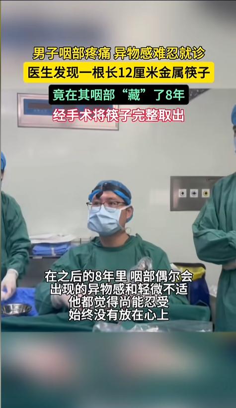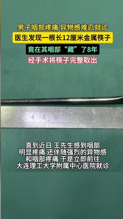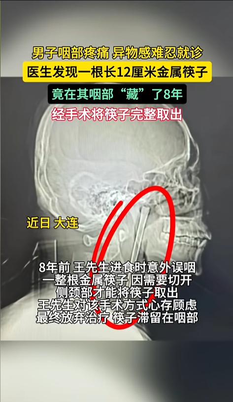 “太吓人了!”近日,辽宁大连,一男子因咽部剧烈疼痛到医院就诊,医生检查发现,一根金属筷子,竟然插在了男子的咽部,足足有12厘米长。更为离谱的是,这根筷子竟然在里面待了8年时间,男子一直没有进行治疗。网友:这也是个狠人啊? 平时吃东西时,不小心吞食了异物,小的东西可能就自己催吐了,吐不出来,或者异物比较大的,一般就去医院治疗了。可您见过,异物很大,但却一直忍着的么? 据媒体3月12日报道,8年前,王先生在吃饭时发生了意外,误吞了一根金属筷子。当时整根筷子就卡在王先生的咽部,上不去也下不来。当时,王先生就去了医院。 那个时候,医院给出了一个手术方案,把王先生的颈部一侧给切开,然后把筷子取出来。这让王先生有些害怕,犹豫再三后,决定不治了,筷子就这样被留在了咽部。 随后这几年里,王先生偶尔会觉得咽部有异物感,但是都还在自己的忍受范围内,渐渐地,他也就放宽心了,没再想怎么治疗的事。就这样,8年过去了。 直到最近一段时间,王先生的咽部开始剧烈疼痛,异物感变得十分明显,他才又去了医院。经过检查,筷子还是卡在那个地方。这一次,医生给出了另一个治疗方案。颈部不需要开刀了,在口腔里面做一个微创手术,就能把异物取出来。 王先生很干脆就同意了,经过治疗,顺利恢复了健康。 网友看后表示,不怪王先生之前不治疗啊,实在是手术方案太吓人了。还好现在医疗技术又进步了!终于脱离了疾病的困扰! 信息来源:《一根12cm金属筷子在男子咽部“藏”8年