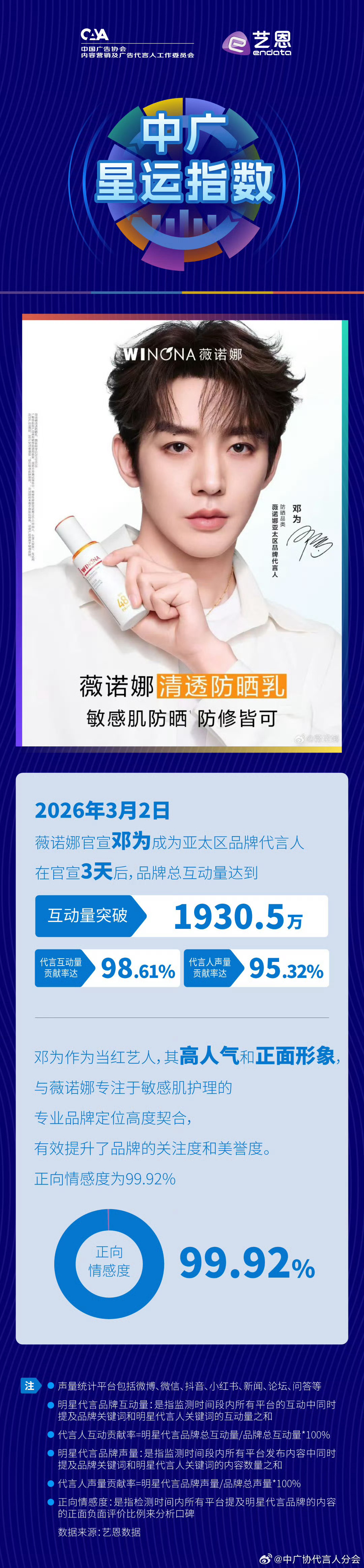 中广协发布邓为薇诺娜官宣代言指数,官宣三天品牌总互动量达到1930.50万,代言人声量贡献率为95.32%,代言互动量贡献率达98.61%,正向情感度为99.92%。并高度夸赞了邓为的高人气和品牌的契合度,且有效提升了品牌的关注度和美誉度,邓为顶级号召力和商业价值!