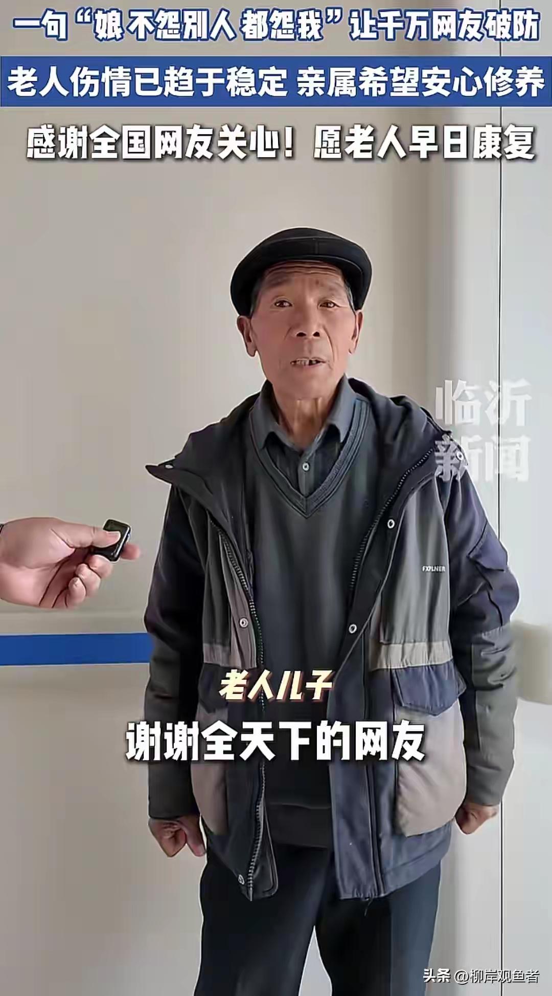 今年的正月十五元宵节的晚上,当时山东临沂兰陵县的李先生,开车经过229省道时,看到地上躺着一位穿着红棉衣的老人,旁边站着一个小伙,表示已经打过120了,不一会儿,老人的儿子赶到,声称自己没照顾好老人,没看好她,咱们是烈士家属,不能讹人啊,医药费自己承担,别耽误小伙,此话一出,围观群众也是满脸感动,李先生将视频发到网上,收获网友们的敬佩。 网友评论: 向烈士们及这位明事理的大哥致敬! 衷心祝愿老人家早日康复安享晚年! 民族精神,传承风骨,伟岸人格,烈士后代,这一刻都在这次事故中得到了升华![赞][赞][赞] 听到老人儿子说的这些话,感觉自己的精神都得到了升华,当时那种情景,到现在依旧平复不了心情。 烈士的后代真另人感动,刻到骨子里的善良,不是装出来的,山东临沂革命老区的人民品行没有被经济大潮污染,和碰瓷的,倒地谁扶赖谁的形成鲜明对此。可敬司歌! 来源:柳岸观鱼者